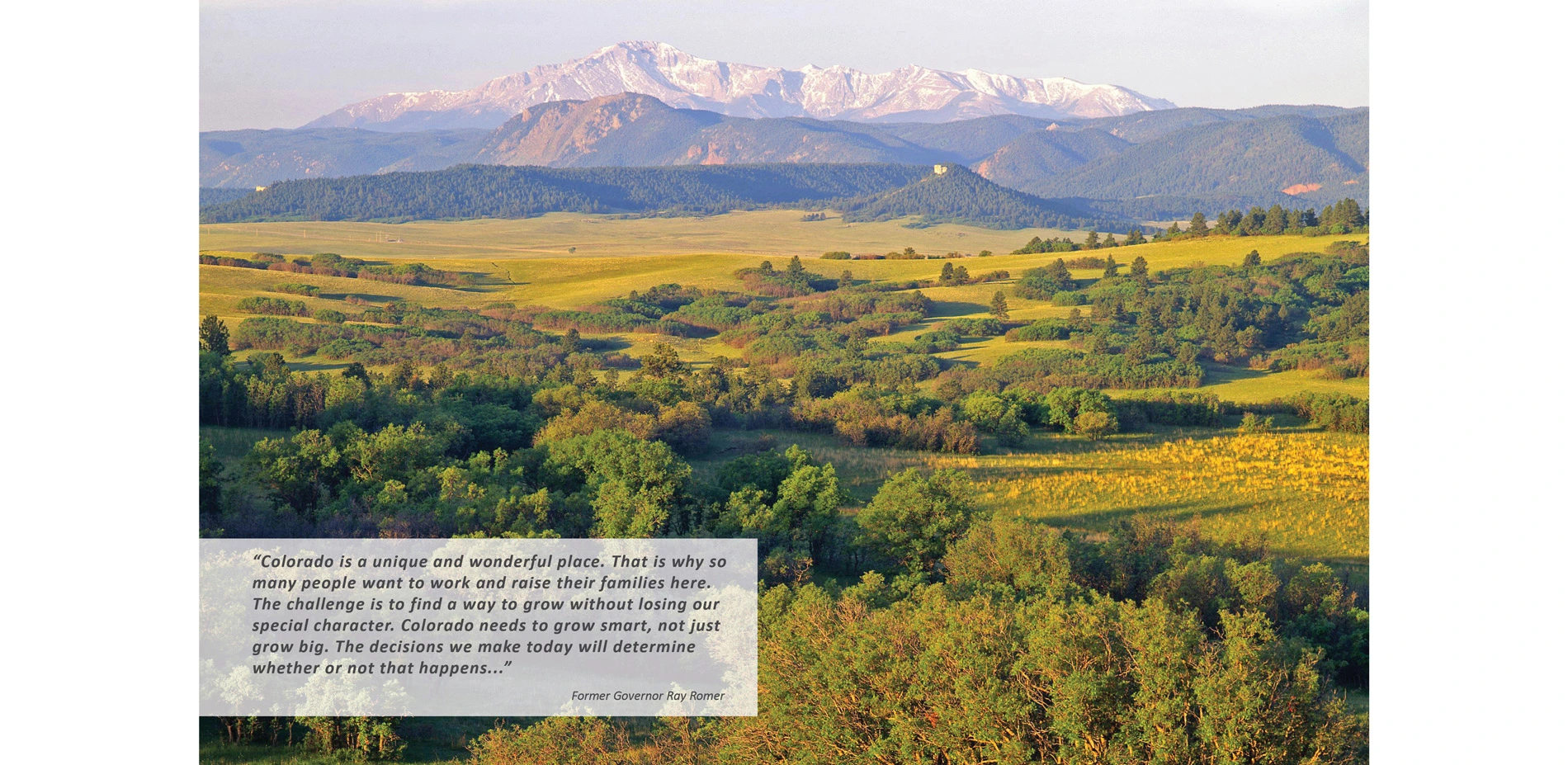Preserving land and scenic resources in Colorado, particularly along the Front Range, has proved virtually impossible for many cities and counties. This is due to rapid growth, high costs of public land acquisition, infrastructure policies that encourage sprawl and a unique exception in state law that allows subdivision of 35-acre parcels without adherence to zoning or other regulations. This exemption ensures that any traditional form of planning can be overturned by any property owner.