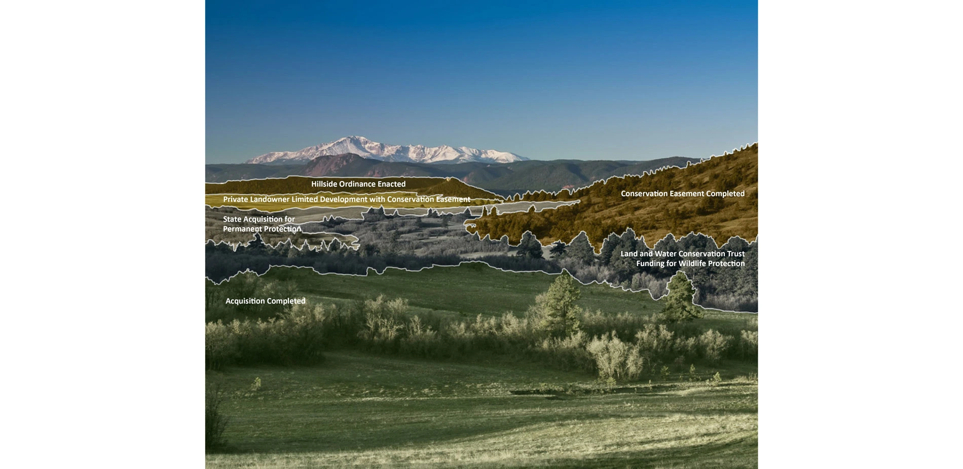 The team's refocused implementation of the planning efforts by securing a multi-million dollar grant from the Great Outdoors Colorado Trust Fund to allow for the immediate acquisition of parcels identified as priority conservation lands. Additional fund-raising facilitated the purchase of areas zoned for dense development, drastically decreasing the proposed densities. The team also proposed that all future development plans for land in the corridor purposely cluster and site houses out of public view, and place any remaining land in permanent conservation easements, ultimately preserving both open space and views in perpetuity.