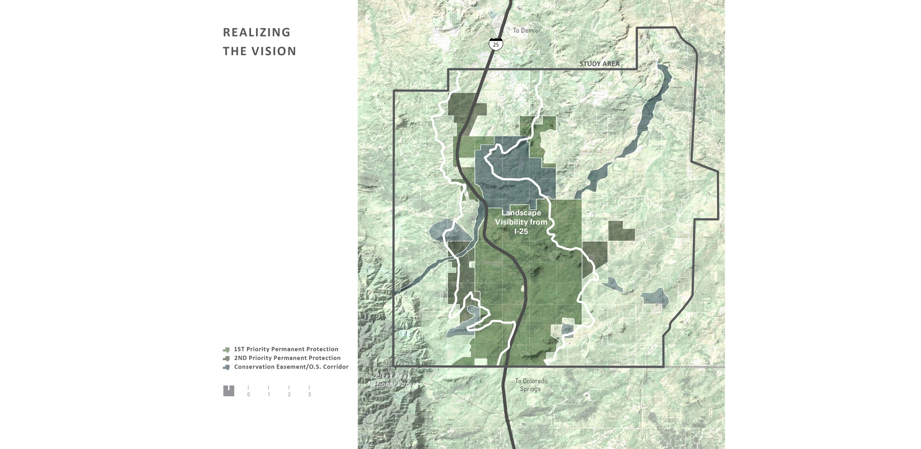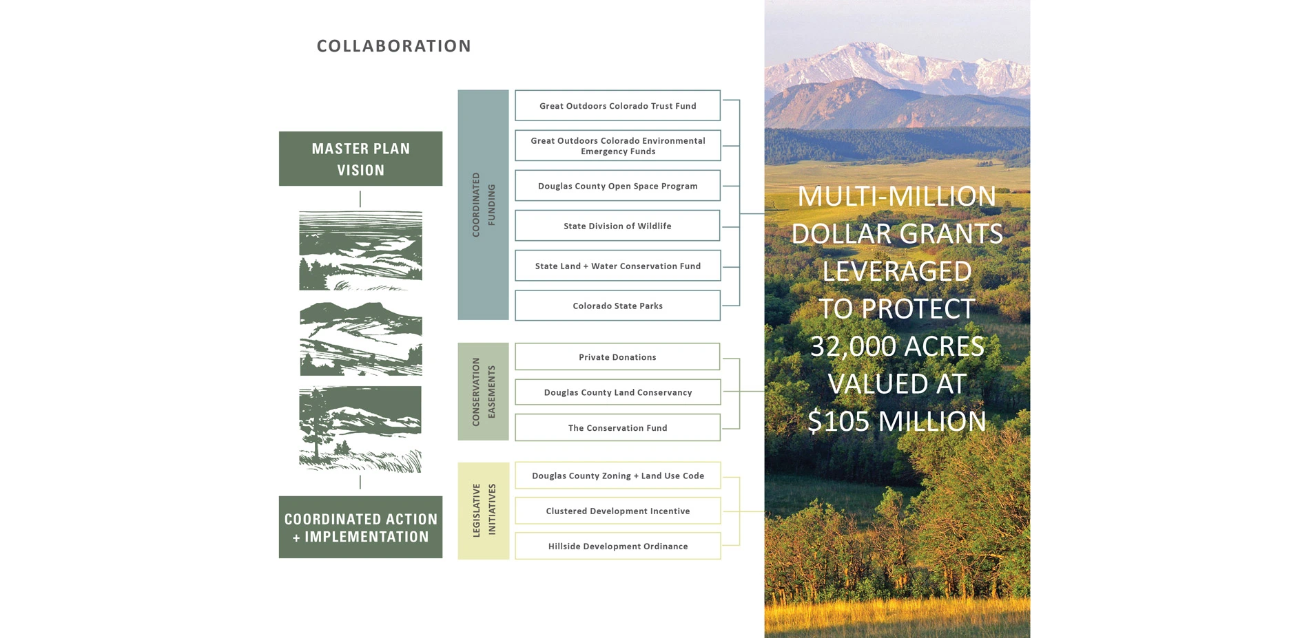 The Conservation Fund, in collaboration with the landscape architect, initiated a strategy to engage residents and government officials in conserving open lands to forever protect scenic vistas, water quality, wildlife, clean air and recreational opportunities along the corridor. Devised to offer solutions to the surrounding uncontrolled sprawl, the plan leveraged unique planning methods and limited development strategies to achieve what had been previously considered impossible: preservation of over 100,000 acres of open space along Colorado's Front Range.