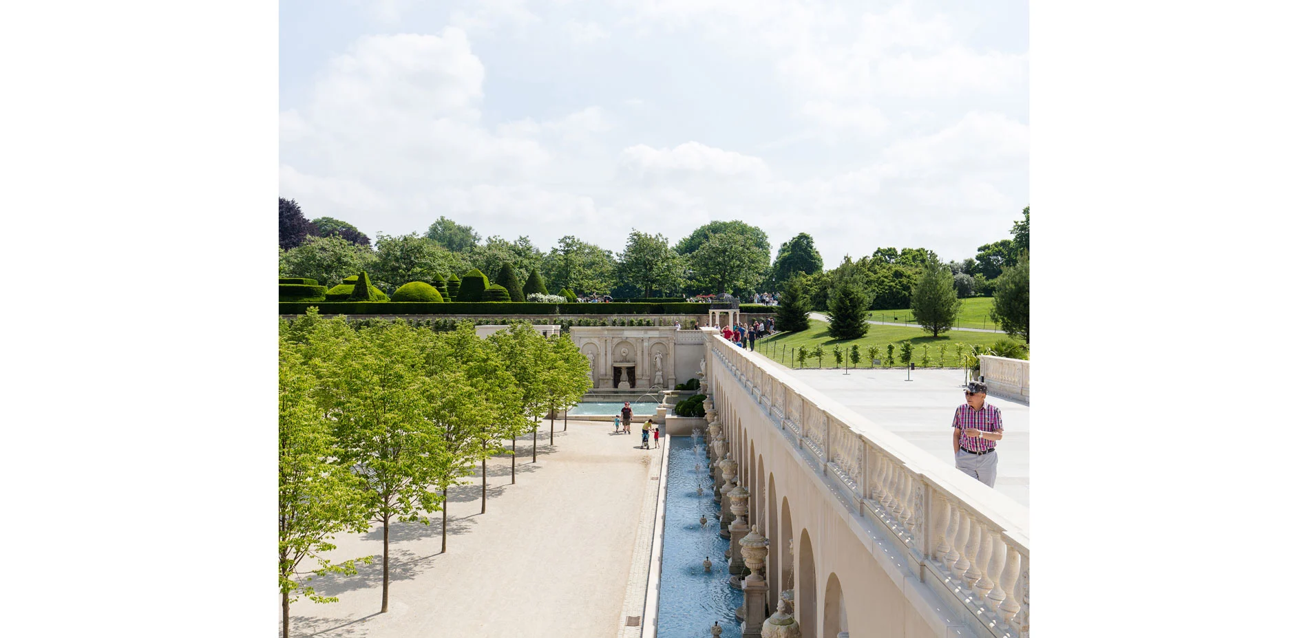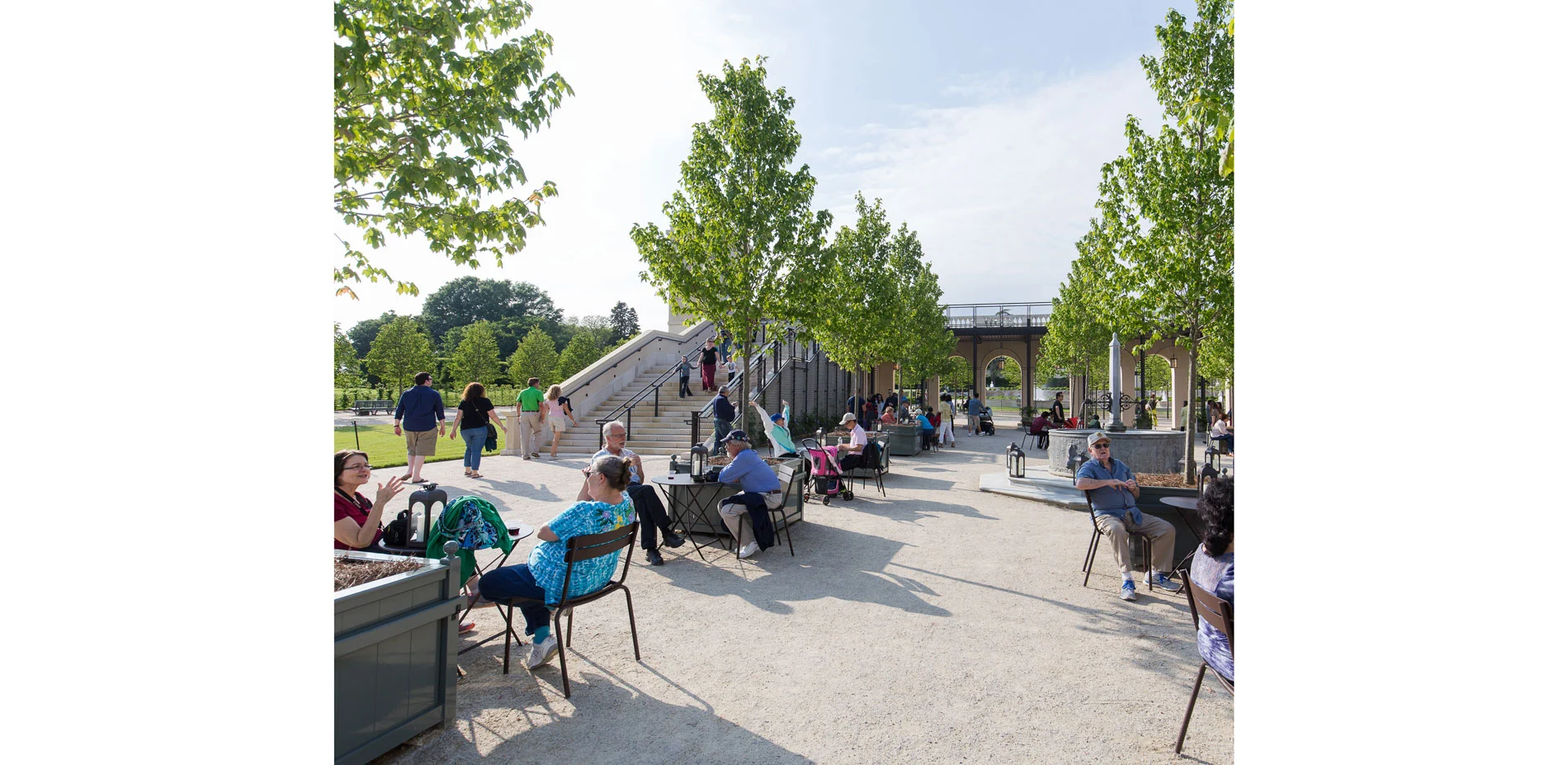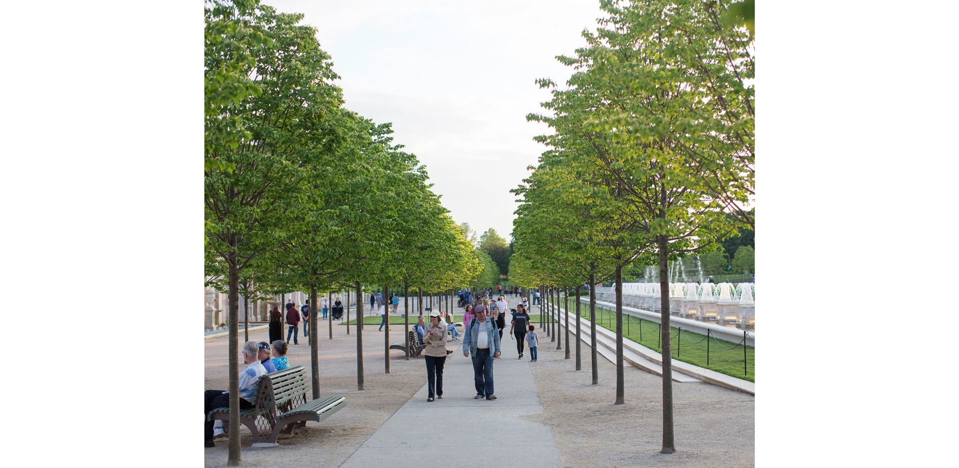 In line with the master plan, new innovative additions were also made, such as the Grotto, which can be entered from passageways on either side of the loggia. It is composed of a vaulted central hall with a circular water curtain in its center. The grotto is lit by natural light that is allowed to enter the space through a limestone lattice-like wall and an oculus – keeping the light dim and offering a sense of mystery. It fits right in and seems as if it has always been hiding there. A newly constructed trellis bridge connects to the fountain terrace and allows guests to look over the surrounding gardens. The Main Fountain Garden also features new seating areas, including a seating wall along the fountain and a seating area with tables and chairs is located behind the trellis bridge. The lobby of the pump house was renovated and is now home to original exhibits from the pump system that powered the garden from 1931 till 2014. The overall landscape has been improved as by means of enhanced horticultural displays and expanded fully accessible walking areas. The Main Fountain Garden was stitched into the greater context by creating new gravel path connectors to the neighboring Topiary Garden and Idea Garden. The major pathways are lined with over 2500 billowing and verdant boxwoods by the name of "Green Beauty". They are only slightly more voluminous than they used to be in du Pont's times. The invasive Norway Maples were replaced with Tilia Cordata "Greenspire", a Linden variety as seen in the great gardens of Paris and Versailles. This is also where the new Fountain Garden benches find their inspiration, combined with contemporary understandings of ergonomics and style.