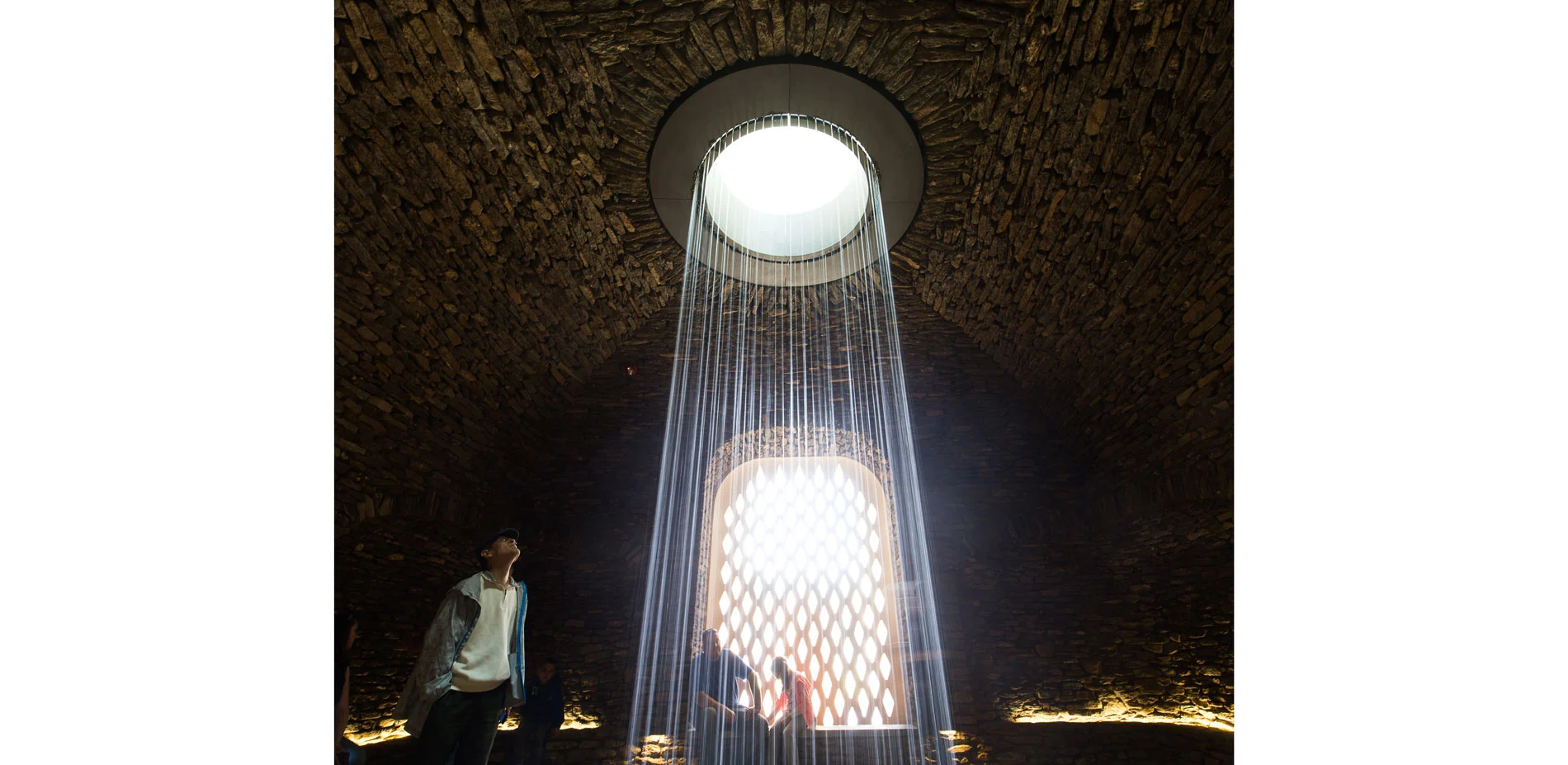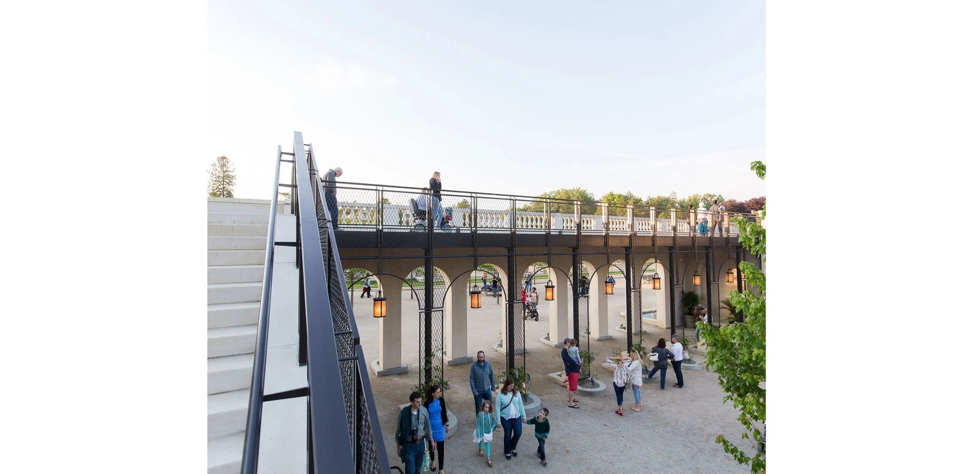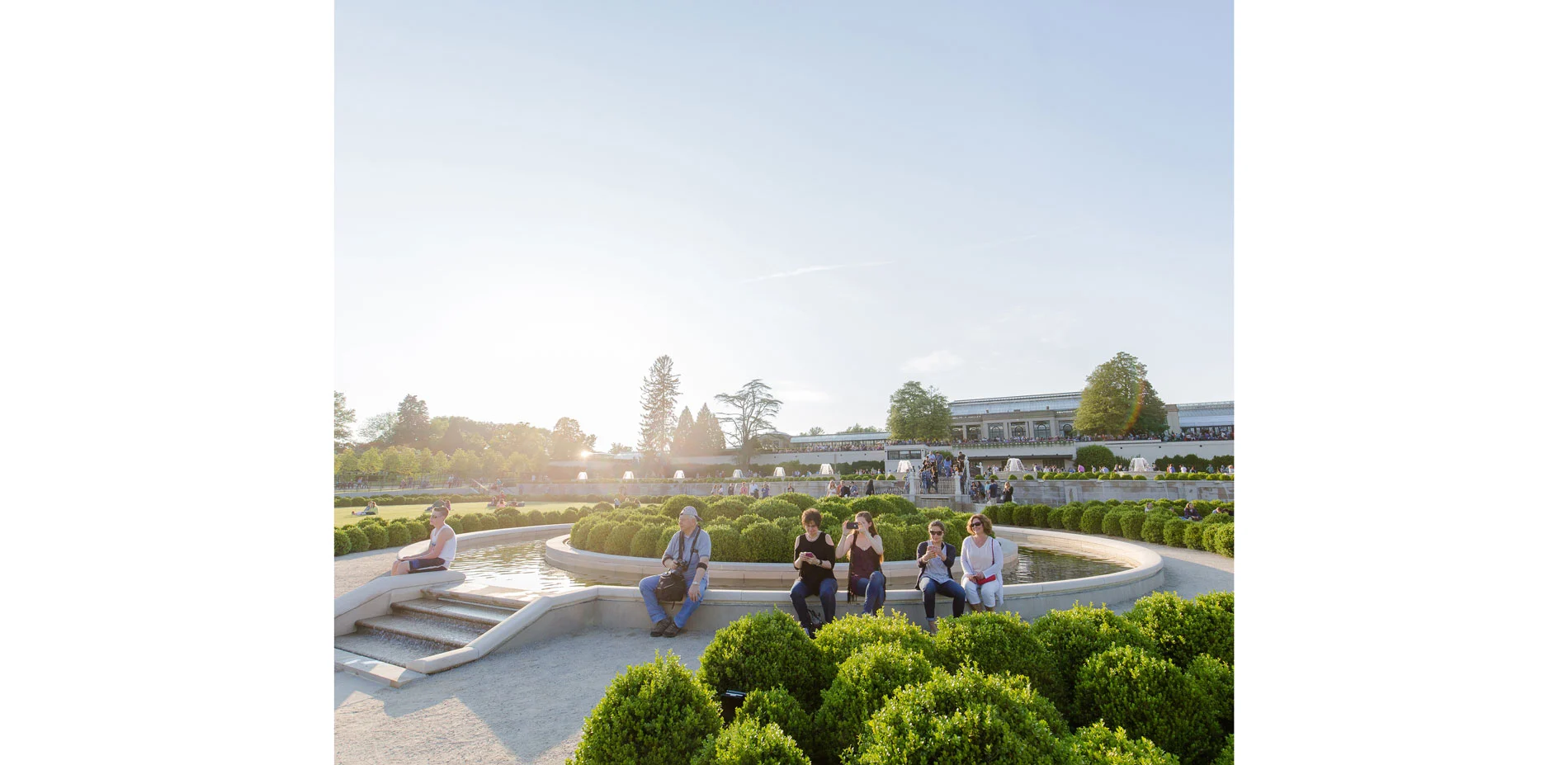 In line with the master plan, new innovative additions were also made, such as the Grotto, which can be entered from passageways on either side of the loggia. It is composed of a vaulted central hall with a circular water curtain in its center. The grotto is lit by natural light that is allowed to enter the space through a limestone lattice-like wall and an oculus – keeping the light dim and offering a sense of mystery. It fits right in and seems as if it has always been hiding there. A newly constructed trellis bridge connects to the fountain terrace and allows guests to look over the surrounding gardens. The Main Fountain Garden also features new seating areas, including a seating wall along the fountain and a seating area with tables and chairs is located behind the trellis bridge. The lobby of the pump house was renovated and is now home to original exhibits from the pump system that powered the garden from 1931 till 2014. The overall landscape has been improved as by means of enhanced horticultural displays and expanded fully accessible walking areas. The Main Fountain Garden was stitched into the greater context by creating new gravel path connectors to the neighboring Topiary Garden and Idea Garden. The major pathways are lined with over 2500 billowing and verdant boxwoods by the name of "Green Beauty". They are only slightly more voluminous than they used to be in du Pont's times. The invasive Norway Maples were replaced with Tilia Cordata "Greenspire", a Linden variety as seen in the great gardens of Paris and Versailles. This is also where the new Fountain Garden benches find their inspiration, combined with contemporary understandings of ergonomics and style.