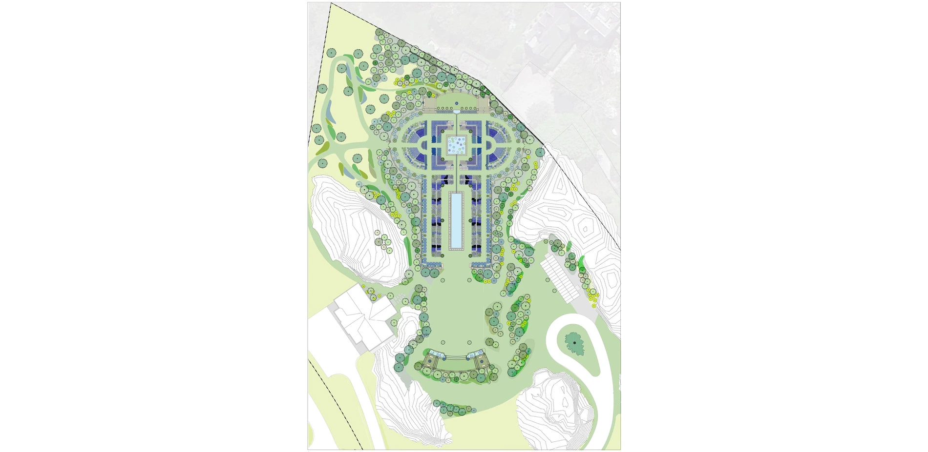 The Olmsted firm's planting scheme incorporated a complex palette that relied heavily upon bedding-out practices, supported by a bevy of gardeners, to maintain the garden in prime condition. The proposed planting plan develops a new model whereby horticultural dependability, drought tolerance, ease of maintenance, and longevity of bloom are factors of importance equal to the blue, purple, white and gray-green hues and the interplay of textures, height, and seasonal diversity of the original scheme.