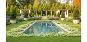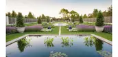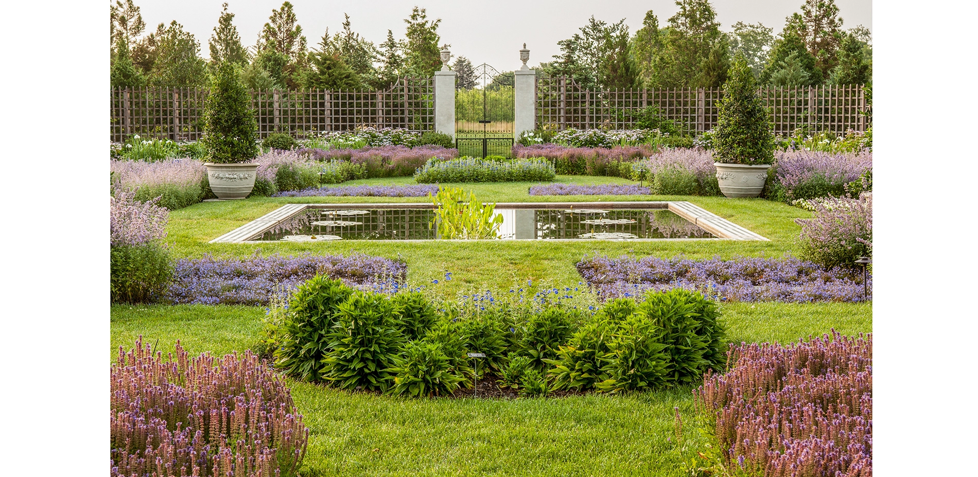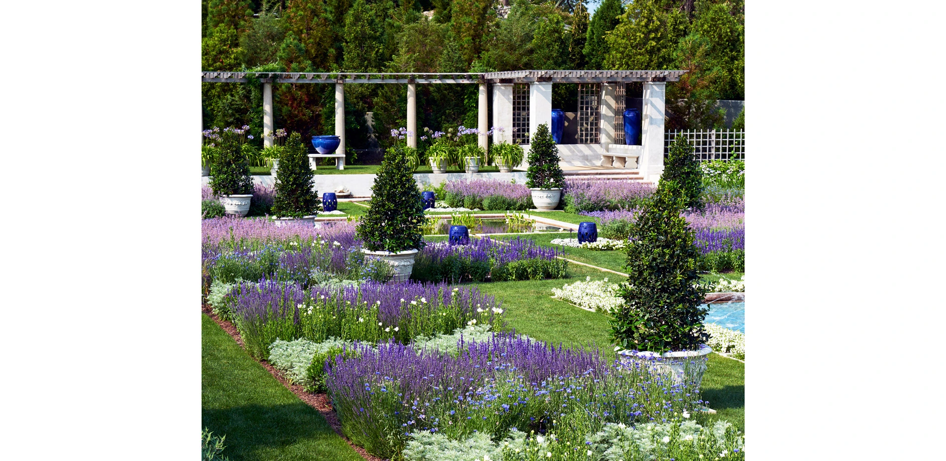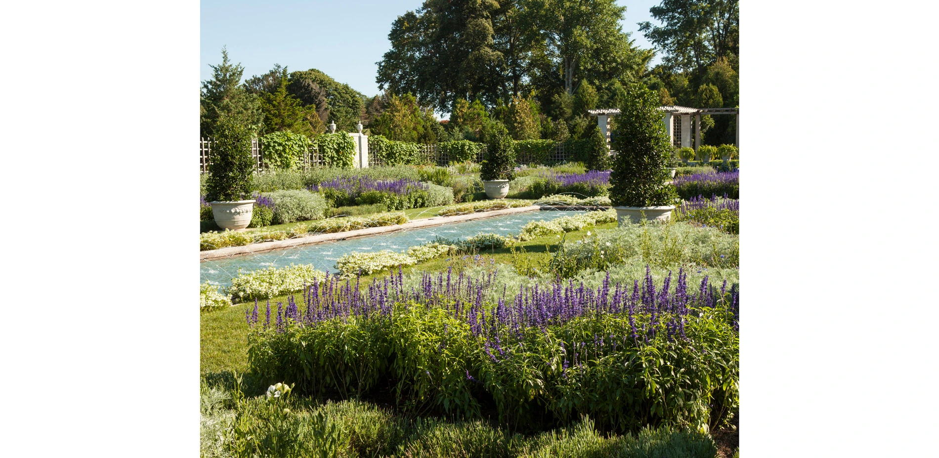 In 1911 Harriet Parson James and her husband Arthur Curtiss commissioned Olmsted Brothers to design their 125-acre estate, Beacon Hill House, near the tip of Aquidneck Island in Newport, RI. As part of the ambitious plan, they developed The Blue Garden, shaped within a hollow of exposed bedrock characteristic of the area, which, over time and with great devotion, became known as a mythic place of alluring beauty. Here, within an enclosed frame of evergreens, walls and pergolas, visitors found an effulgent, classically disposed garden of blue flowers. Along the length of the axis of the formal beds, a channel of water connects a square pool of water lilies with a long pool of blue tiles inspired by Persian rugs, punctuated by fountain jets.