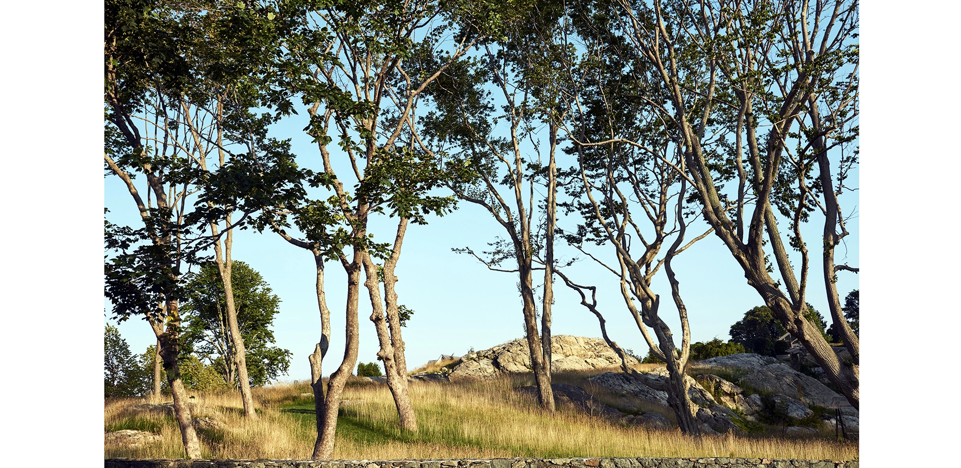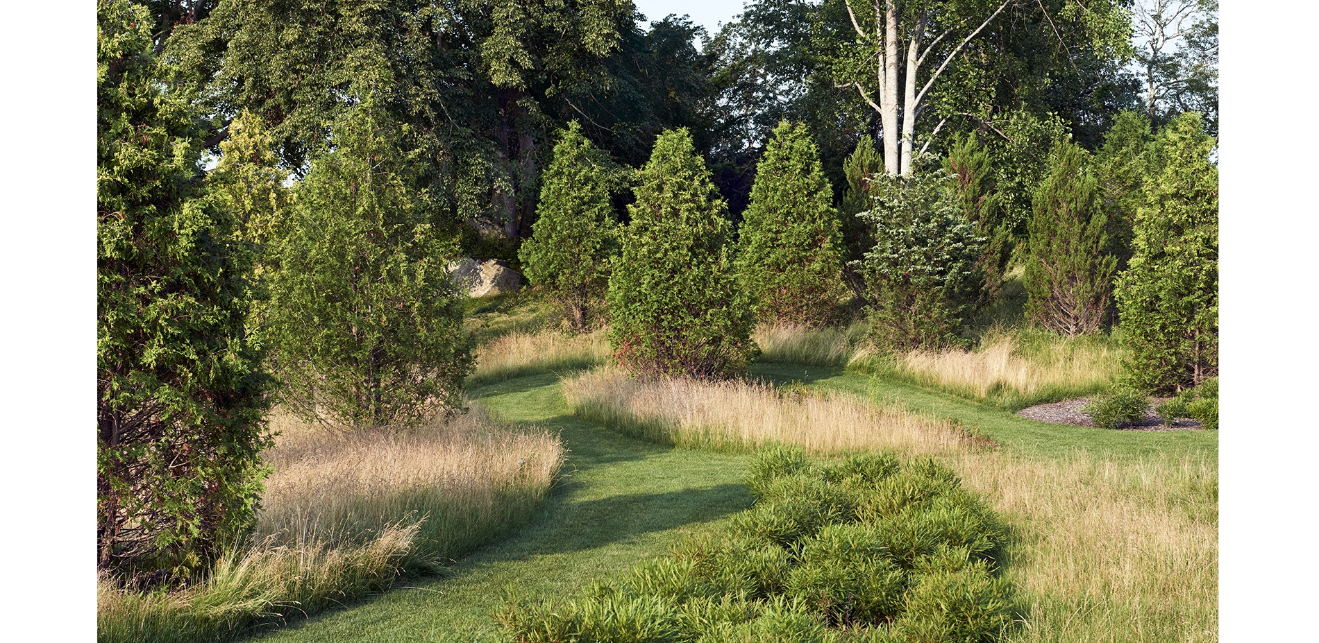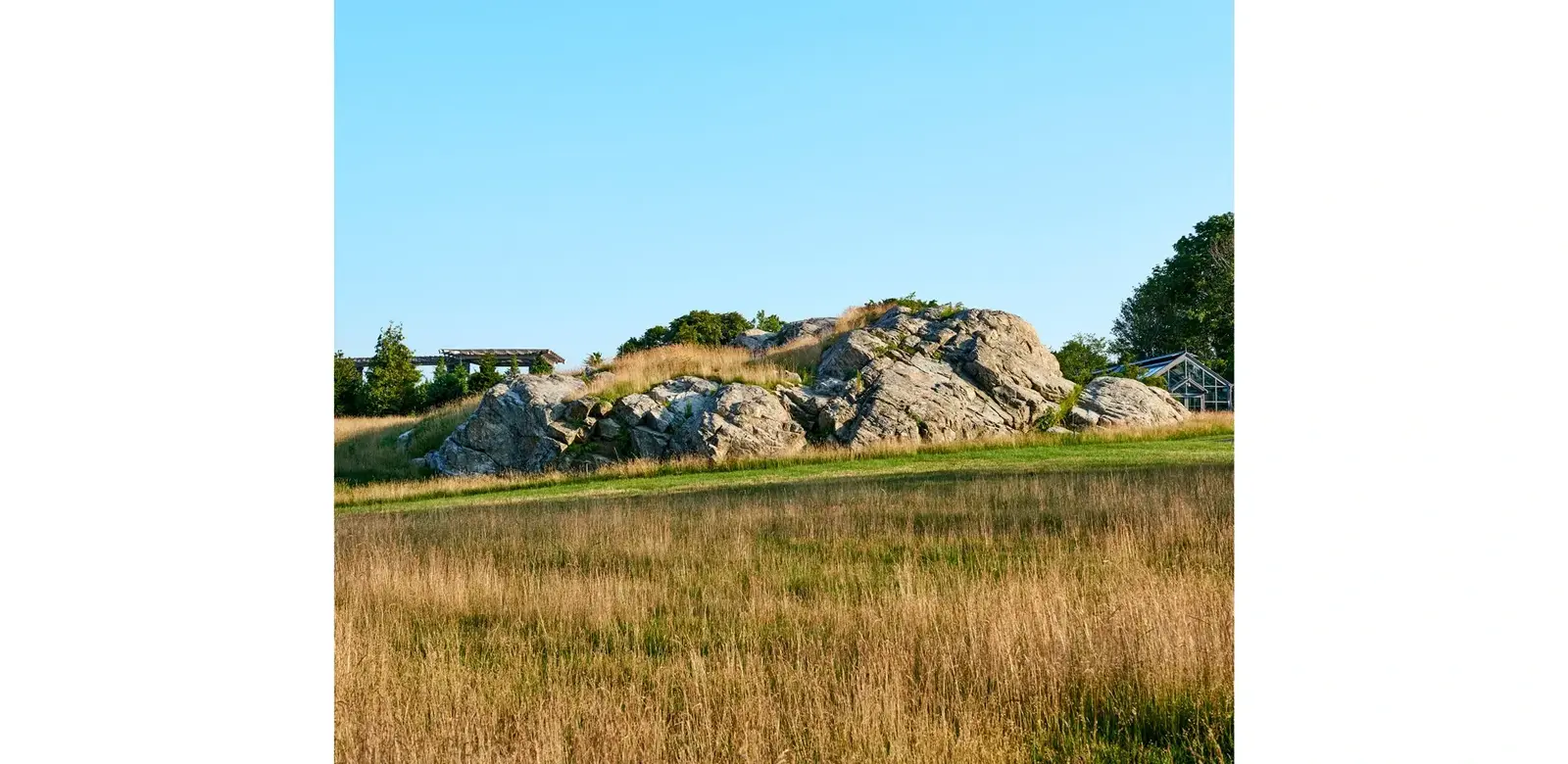 The scheme for the garden's context, originally conceived as a frame of diverse evergreen trees dispersed among the rock outcroppings to enclose and protect the garden, also was simplified and tailored. The landscape architect proposed new mixed evergreen plantings of appropriate heights for the garden's light requirements, strategically placed to screen adjacent development or to frame vistas of the preserved agrarian landscape. Paths weave through the native evergreen plantings to offer closer experience of the exposed glacial topography.