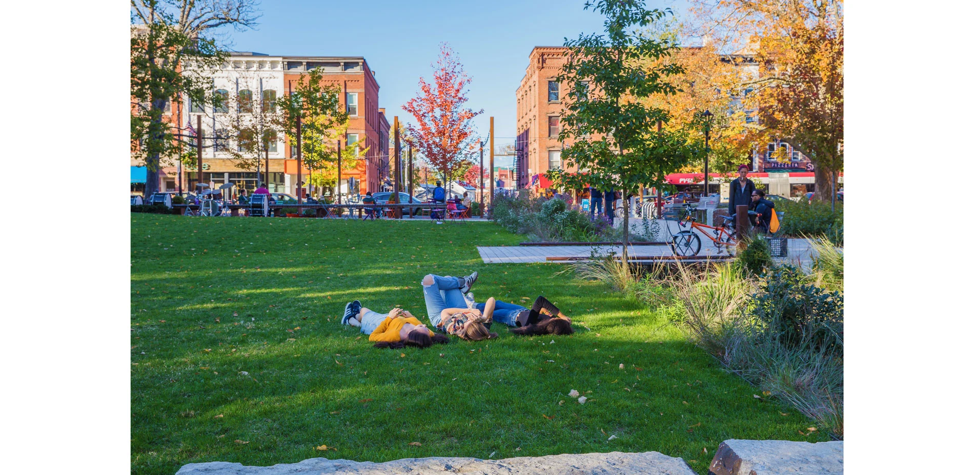 As the only substantial open green space in the heart of the City, an expansive south-facing lawn acts as a village green, providing a flexible, central open space for informal gathering, play and cultural events. At the west edge, a stage bridges over the stormwater garden and extends into the woodland garden for seasonal events. A new iconic holiday tree was sited at the southern edge with ample gathering space around it for festivities.