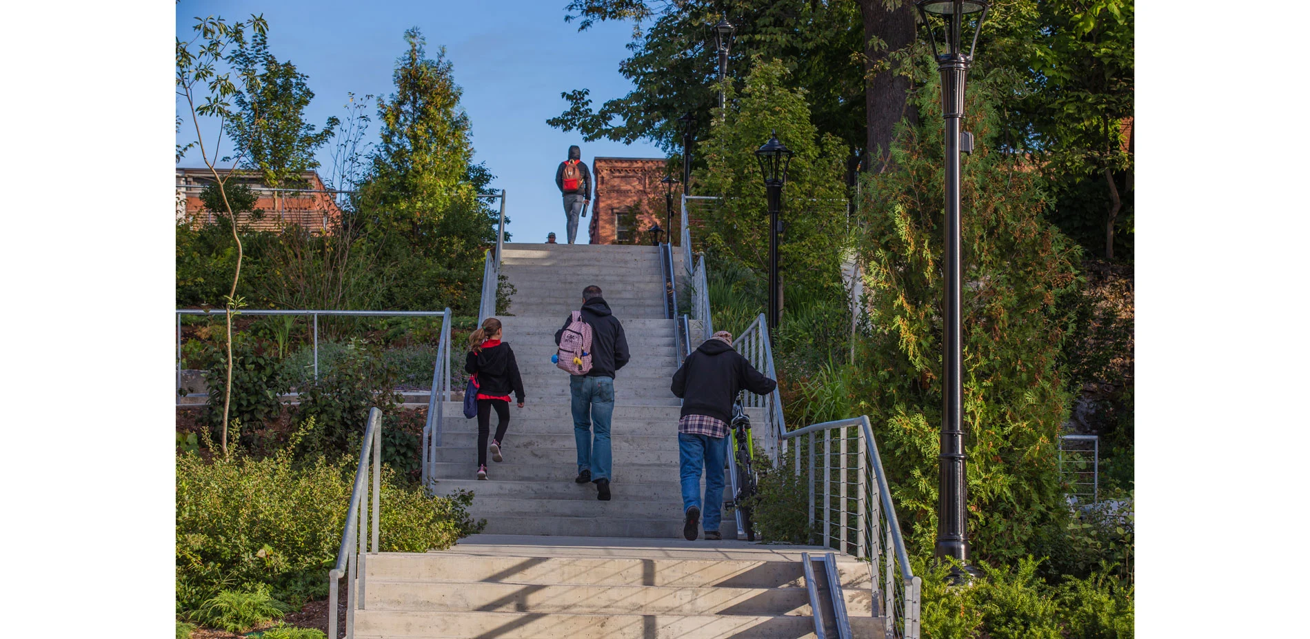 Over thirty feet of grade change occurs on the previously overgrown south slope of the Park. The design reclaims this landscape, extending the Park into the parking lot below, allowing for an occupiable hillside. A series of accessible walkways, a stairway and gathering spaces for amphitheater-style events now offers historic views to the Holyoke Range, and the slope is restored with indigenous river plants. The main thoroughfare re-connects the Park, and downtown, directly to the Norwottuck Rail Trail and the Mill River Ghost Walk.