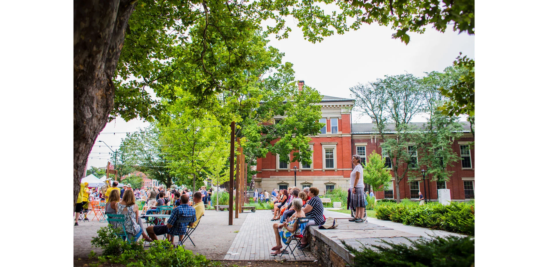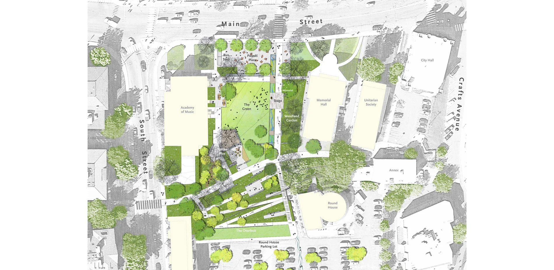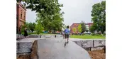 Re-envisioning Pulaski Park is a restoration of the only remaining green space in downtown Northampton, Massachusetts. At 2.5 acres, the Park is small but mighty. After renovations in the 1970s paved much of the site, the Park had entered a state of disrepair and benign neglect. The Landscape Architect collaborated with the City Engineer to acquire funding through numerous grants and engaged in a year-long public forum design process for community input. The result is a landscape that is an honest representation of the City of Northampton's diversity, industrial heritage, and social and environmental values. The concept for the new design was to reconnect the heart of the City to its buried ecological and cultural history. This was done through the creation of new landscape spaces, restored ecologies, and major pedestrian connections that have a City-wide impact.