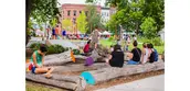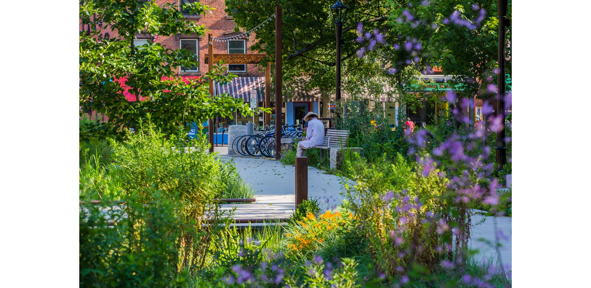 To enliven the streetscape edge, Pulaski Plaza forms a civic space of permeable paving for engaging the vibrant activities of downtown (street performance, social activism and community festivals). The plaza also provides a clear space for the daily needs of bicycle parking and bus shelters for an active bus stop. Moveable tables and chairs are a colorful reflection of the City's diverse population. A large fountain carved from local Goshen stone sits at the edge of Pulaski Plaza and the bioswale. It has become a popular play feature for children and birds during the warmer months.