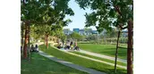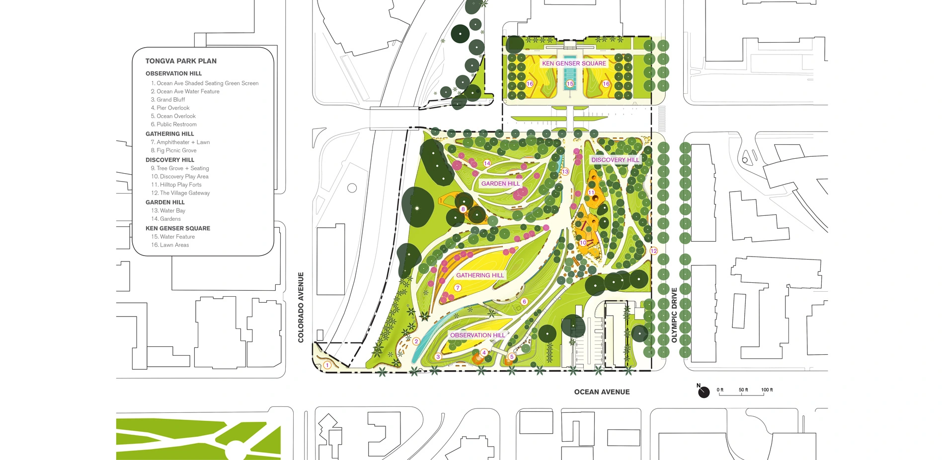 Situated on 7.4 acres between City Hall, the Interstate-10 freeway, and Santa Monica's iconic palm tree lined Ocean Avenue, Tongva Park + Ken Genser Square have transformed a derelict and flat parking lot into lush landscape of rolling hills, swales, Mediterranean meadow gardens, and active urban spaces.