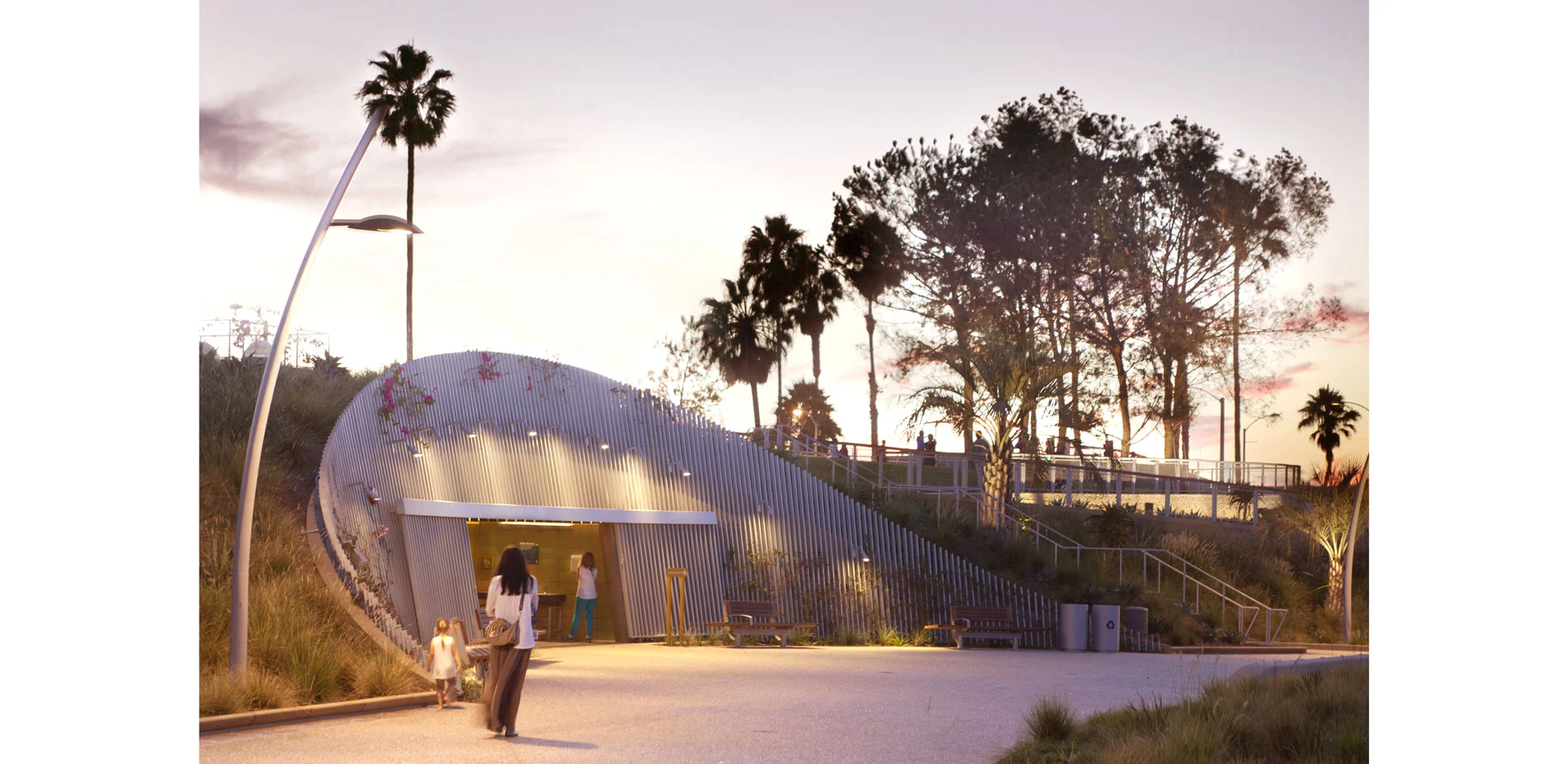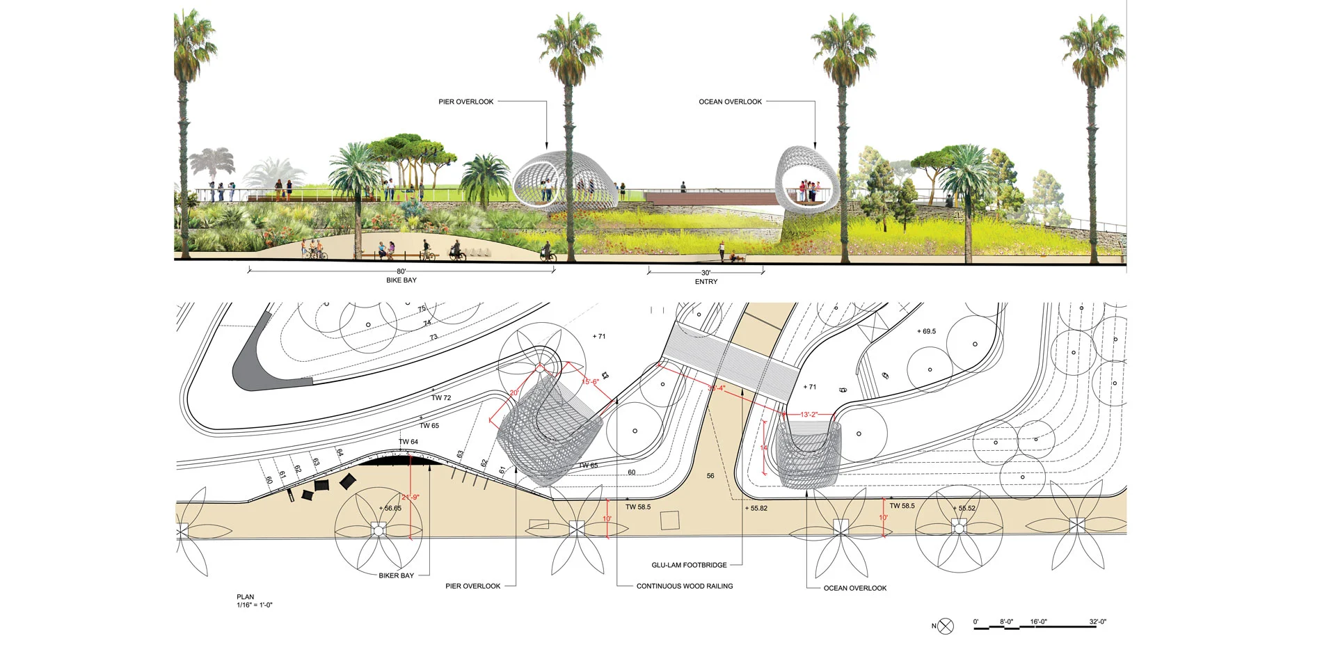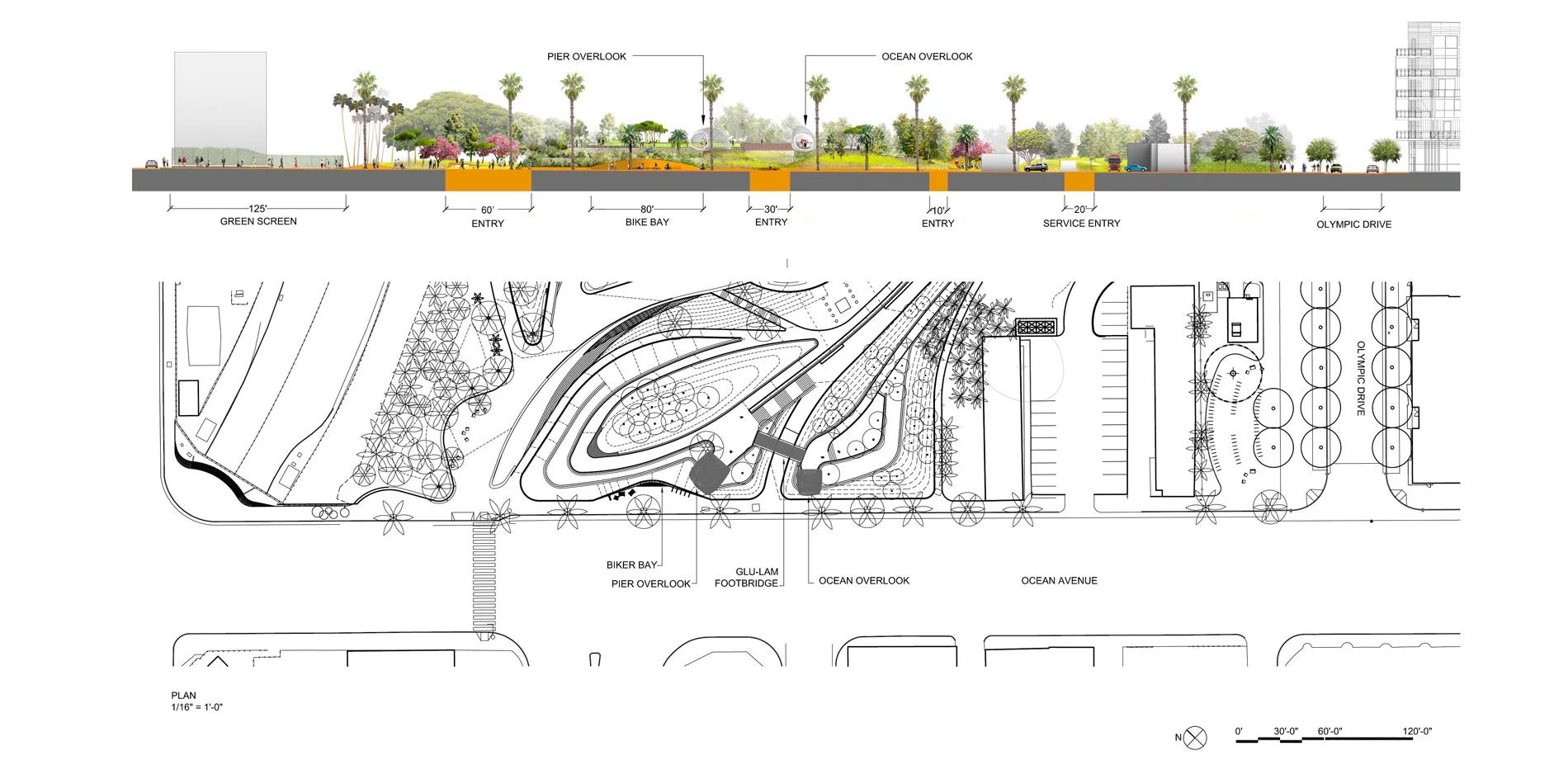 Inspired by the Southern California arroyo landscape of washes and ravines that once defined the site, a series of braided pathways appear to organically emerge from the footsteps of City Hall, extend west to Ocean Avenue, and weave the park into the fabric of the City. Architectural features, water features, a texturally rich material palette, and lushly planted meadows and gardens reinforce the site's "arroyo" history, while at the same time, creating an exciting new identity that is unique to Santa Monica. Dramatic rising and falling topography reinforces the fluid pathway system and organizes the site into four thematic hilltop areas, each calibrated to a different primary use and experience:
