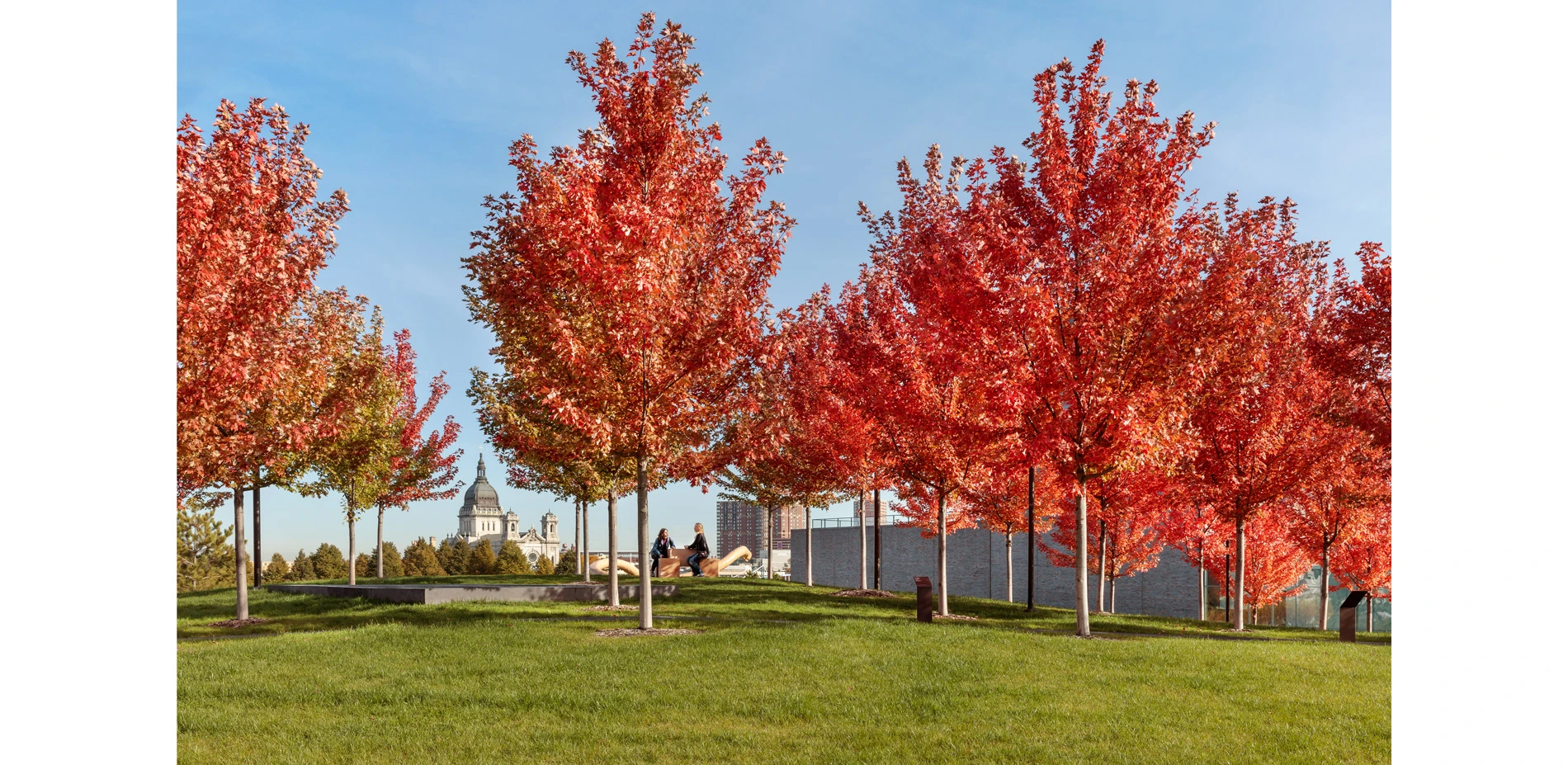 Red Pine, Minnesota's State tree forms the tree room of Volume 8. Thesculpture Garden Seating by Akagawa was sited to capitalize on the view of the Sculpture Garden, Basilica and Minneapolis downtown skyline.