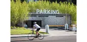 Volume 9, a grove of Paper Birch, surrounds the concrete parking garage entrance with a vibrant presence, easing the ability to find the entrance. The wayfinding signage clearly connects the two points of entry.