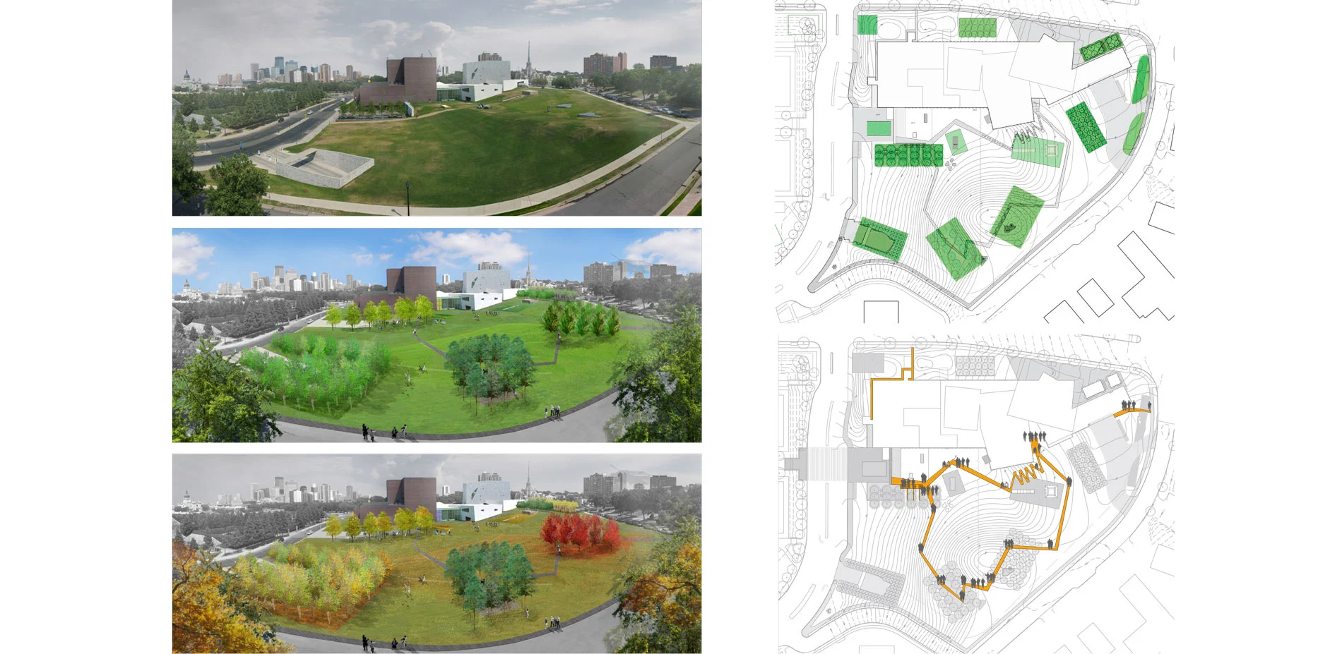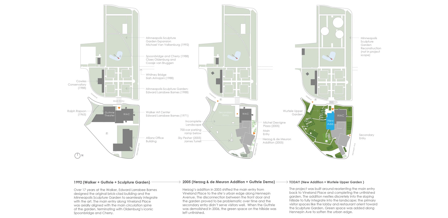 With a campus that includes existing architectural masterpieces by Edward Larrabee Barnes (1971) and Herzog and de Meuron (2005), the Minneapolis Sculpture Garden (MSG) by Edward Larrabee Barnes (1999) and Michael van Valkenburg (1992), and plaza by Michel Desvigne (2005) the Walker offers a multidisciplinary and diverse approach to the interpretation of art. However, when the Herzog expansion shifted the main entry away from the MSG to Hennepin Avenue, the Walker suffered from an absence of clear identity and circulation, particularly from the MSG. In addition, the art center lacked an engaging public space that could unify the Walker's distinctive architecture and iconic landscape.
