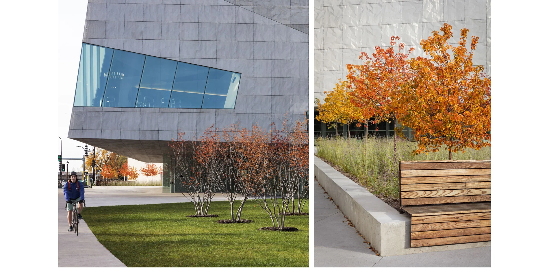 The design landscape architect worked in concert with the design architect to create, a new vision for the campus. The design concept of a new building addition within a garden created a more visitor-friendly and welcoming entry experience. The new addition is now the epicenter of the Walker Art Center's campus and strengthens the museum's identity and presence. The updated garden campus is comprised of twelve varying plant material Volumes that are expressed by masses of shrubs, ornamental grasses, and formal geometric bosques of trees or a crisp, faceted plane of lawn holding a beautiful sculpture.