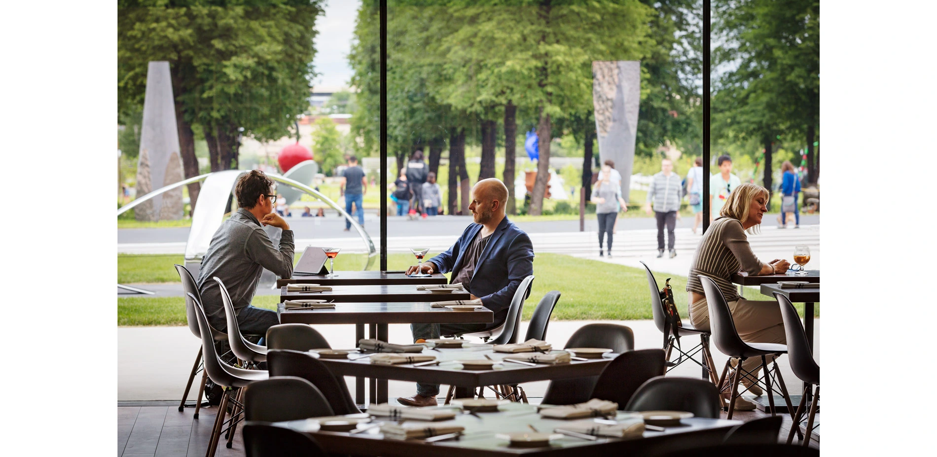 Marching down the hill via either the stair or zigzag path, one lands in the patio outside of Esker Grove, the new dining room. Here, an overstory of Skyline Honeylocusts forms Volume 11. Visitors may sit and dine beneath the filtered shade, appreciating the plants and art while enjoying food and the company of others. A black concrete seatwall holds the edge of the patio space.