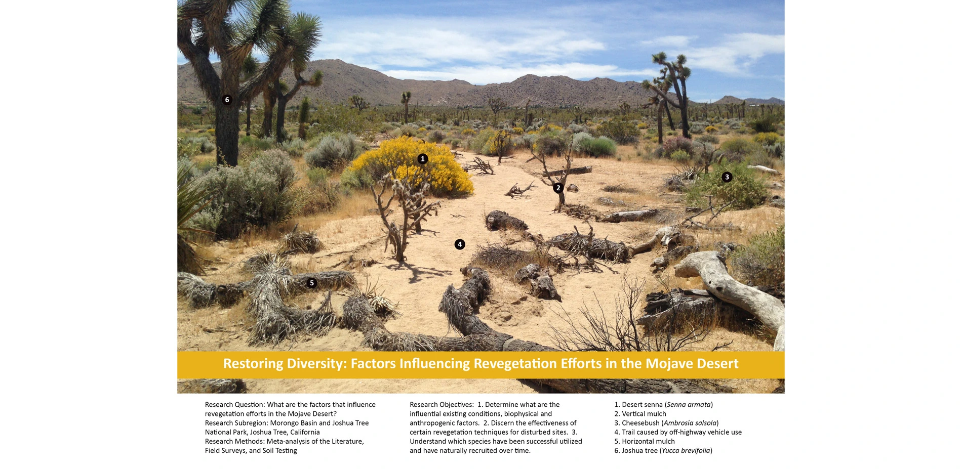 This research examined the capacity for restoration projects to ameliorate disturbed sites in the desert in the context of unprecedented biodiversity loss and potential extinction of species. The study investigated what factors influence revegetation efforts in the Mojave Desert through meta-analysis and field surveys. The goals were to determine influential existing conditions, biophysical, and anthropogenic factors, assess the effectiveness of revegetation techniques, and comprehend vegetation succession following the revegetation of disturbed arid sites.