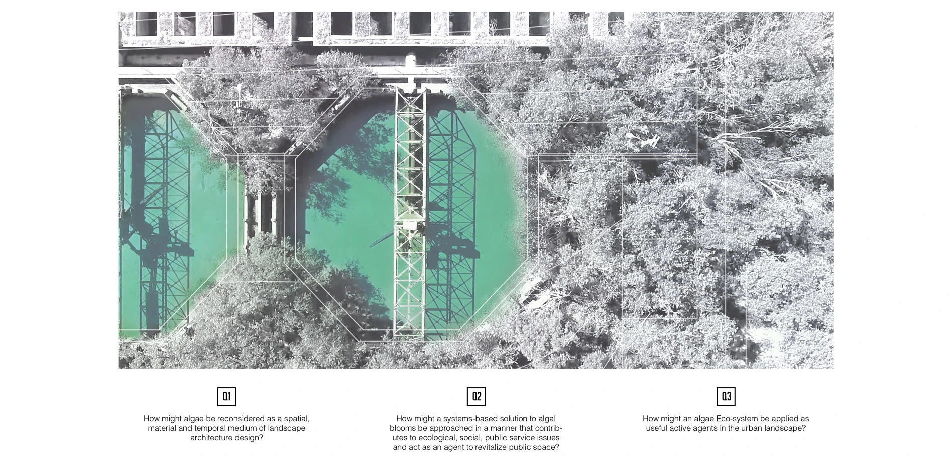 This project aspires to explore how problematic levels of algae (specifically Bioluminescent Algae, Blue Green Algae and Diatoms Algae) in waterways might be addressed through innovative landscape design strategies that move beyond reductive en