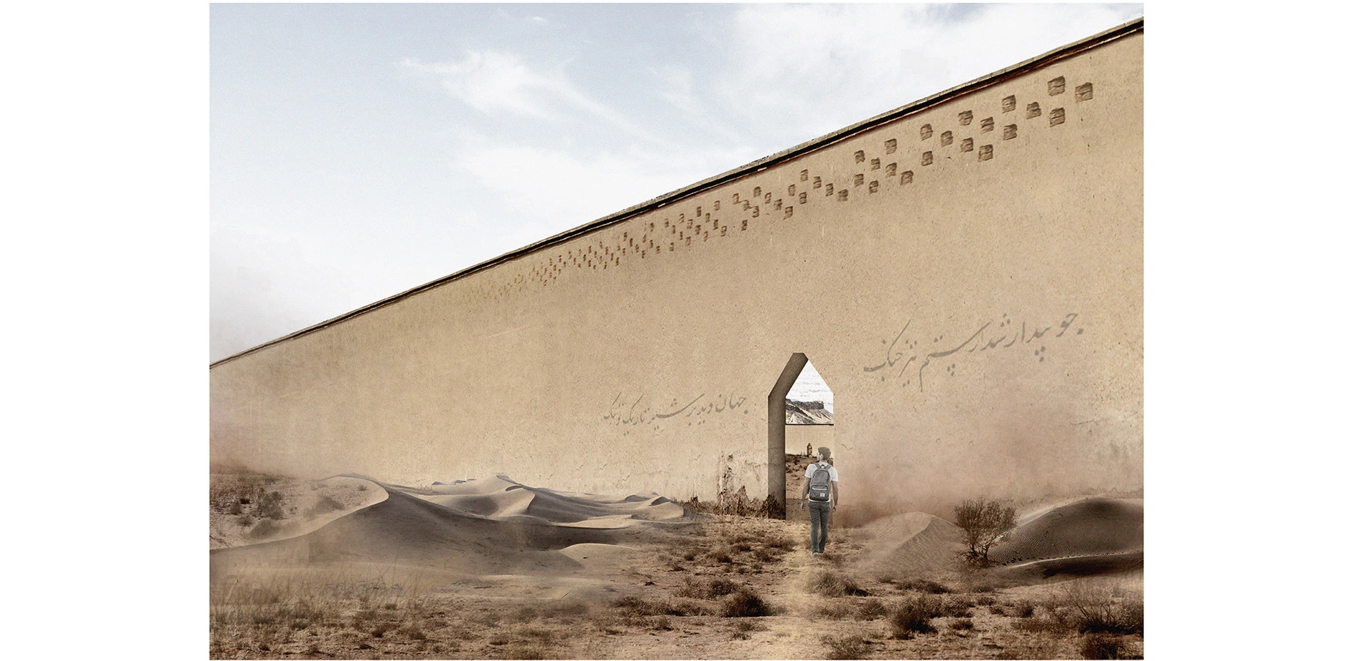 Based on the physics of dust storms, and with the threefold objective of ecological improvement, cultural reconnection, and a diplomatic gesture, this thesis proposes implementing an armature in the landscape: a series of strategically located walls that takes advantage of natural forces.