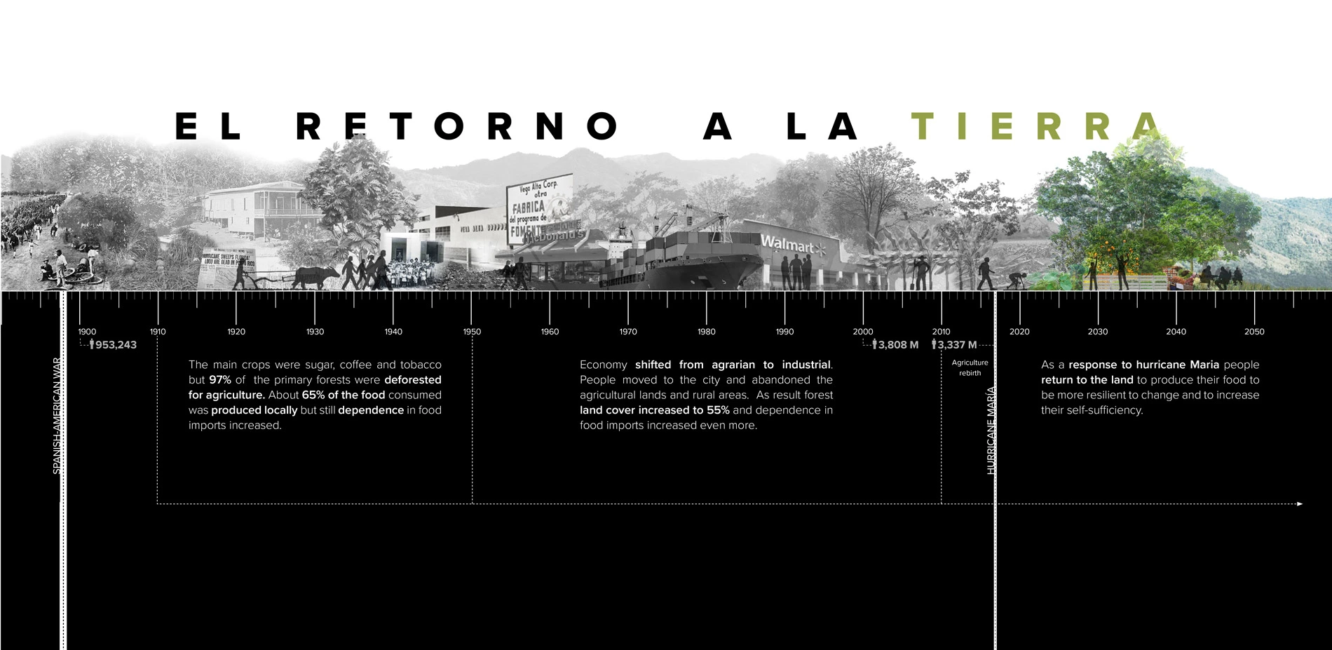 Puerto Rico imports eighty-five percent of its food and the agricultural industry was decimated by hurricane Maria. "El Retorno a la tierra" empowers communities to produce their own food and be self-sufficient. This project presents strategies that could be implemented within the landscape in a barrio for the community to produce their own food. It uses the basic unit of the barrio as a model that could be expanded to other areas. It finds opportunities in the current condition of the forests in the aftermath of hurricane Maria and proposes an integration of food crops with the reforestation efforts in the forests edges, pastures and grasslands. In the 1930's Puerto Rico had an agricultural economy and most of its land was dedicated to agriculture, but this "Retorno a la tierra" is different because it focuses on the diversity and ecological basis of subsistence agriculture, rather than export agriculture that was primary dominated by monoculture. This proposal establishes a new community-based agroecology that creates the possibilities for bringing people back to the land.