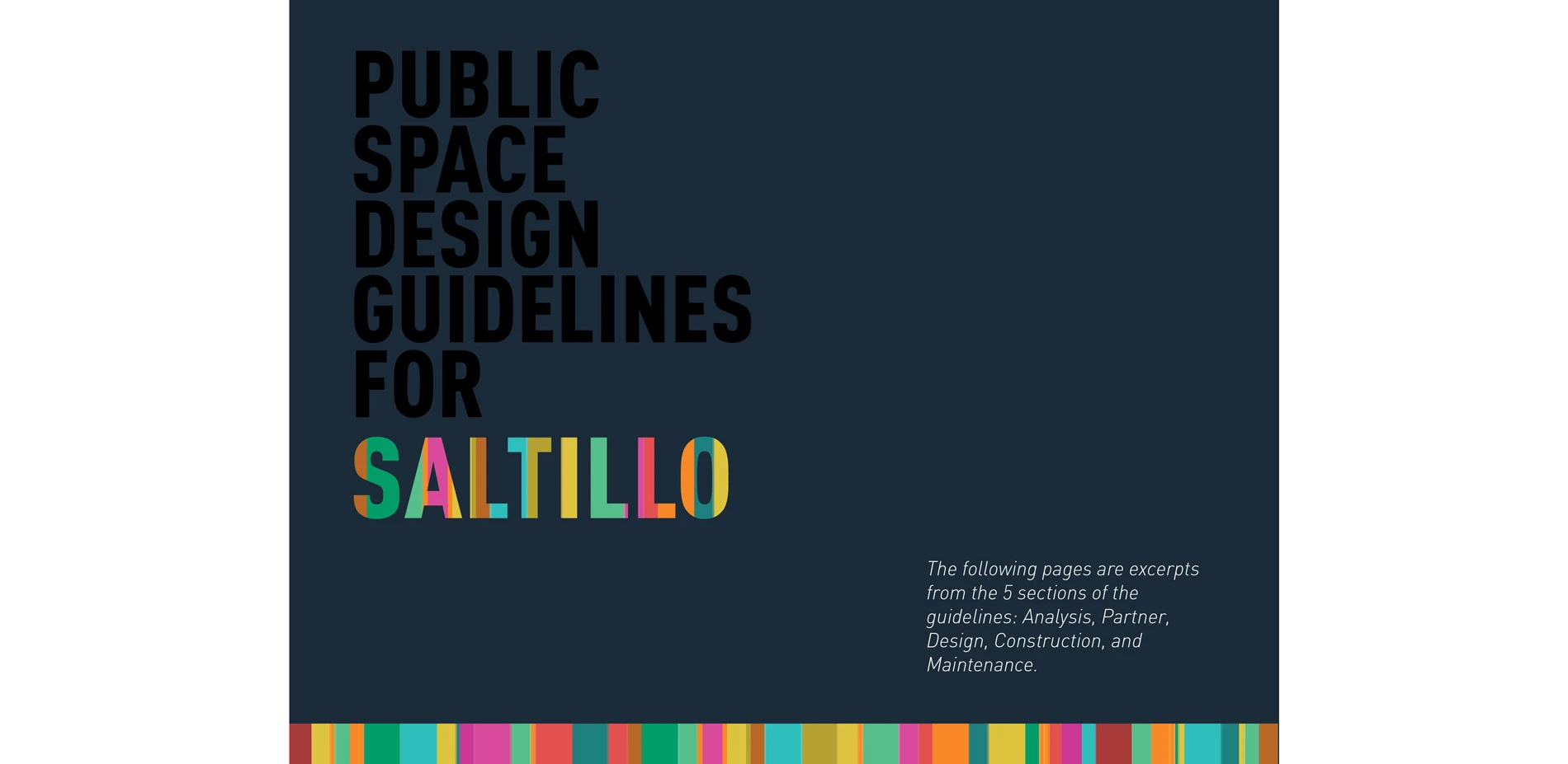 The premise of the studio project, in partnership with the Planning Institute of Saltillo (IMPLAN), was to develop urban design guidelines for the city of Saltillo with the objective of improving the quality of life of citizens through better public spaces. These guidelines, which are currently being distributed in Saltillo, were divided into five sections: Partner, Analysis, Design, Construction and Maintenance, to address the full life cycle of a project. This p