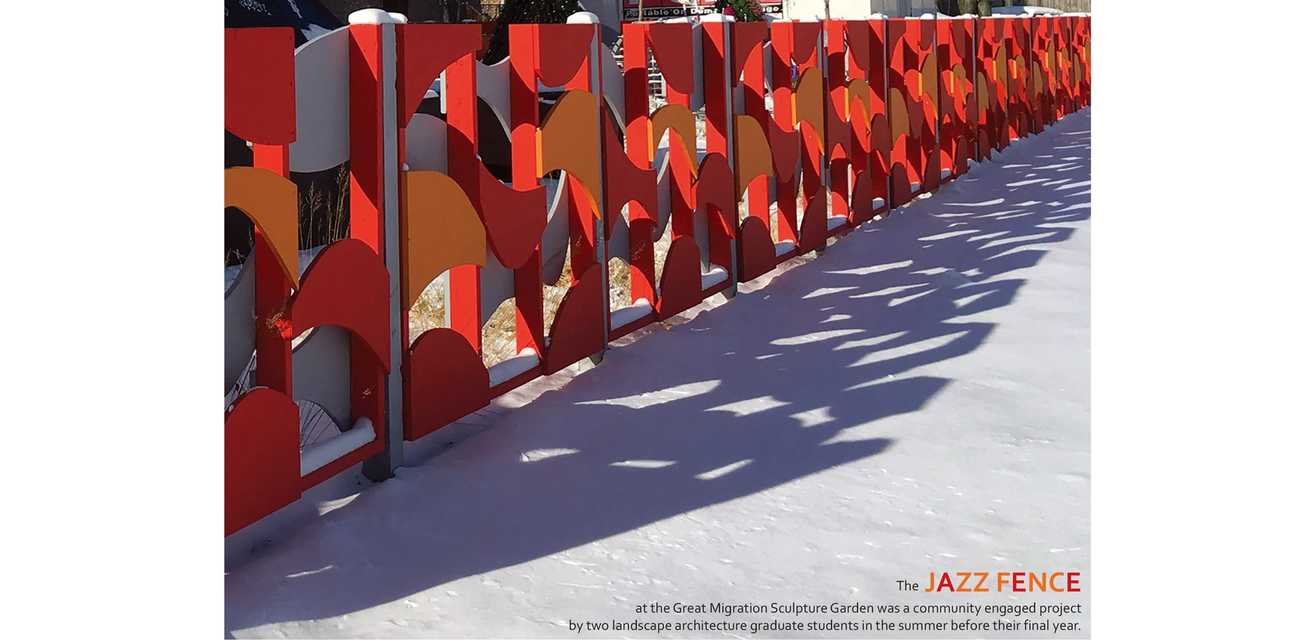 Jazz Fence encloses the Bronzeville neighborhood's new Great Migration Sculpture Garden and was designed and built by two students of Landscape Architecture in collaboration with community leaders, construction trades, neighborhood youth, and professional advisers. Jazz Fence was a design investigation of shadows, geometry, and color to augment the sculptural program of the garden which was constructed on a surplu