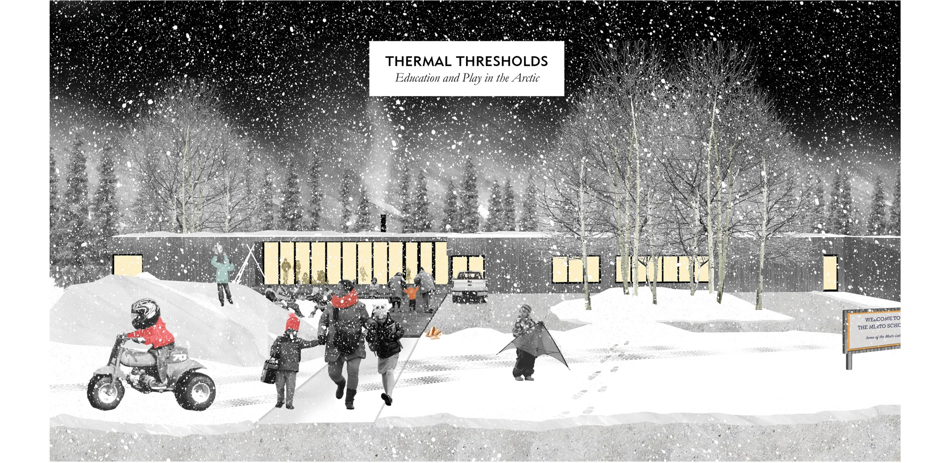 This collaborative project addresses the lack of healthy outdoor and indoor spaces for Arctic inhabitants - specifically children - by developing a seasonally dynamic school in interior Alaska. It is a region of climatic extremes, ranging from -50F to 80F, which has recently generated an architecture solely focused on the building threshold, insulating indoor space from these harsh conditions at the cost of alienated outdoor spaces.