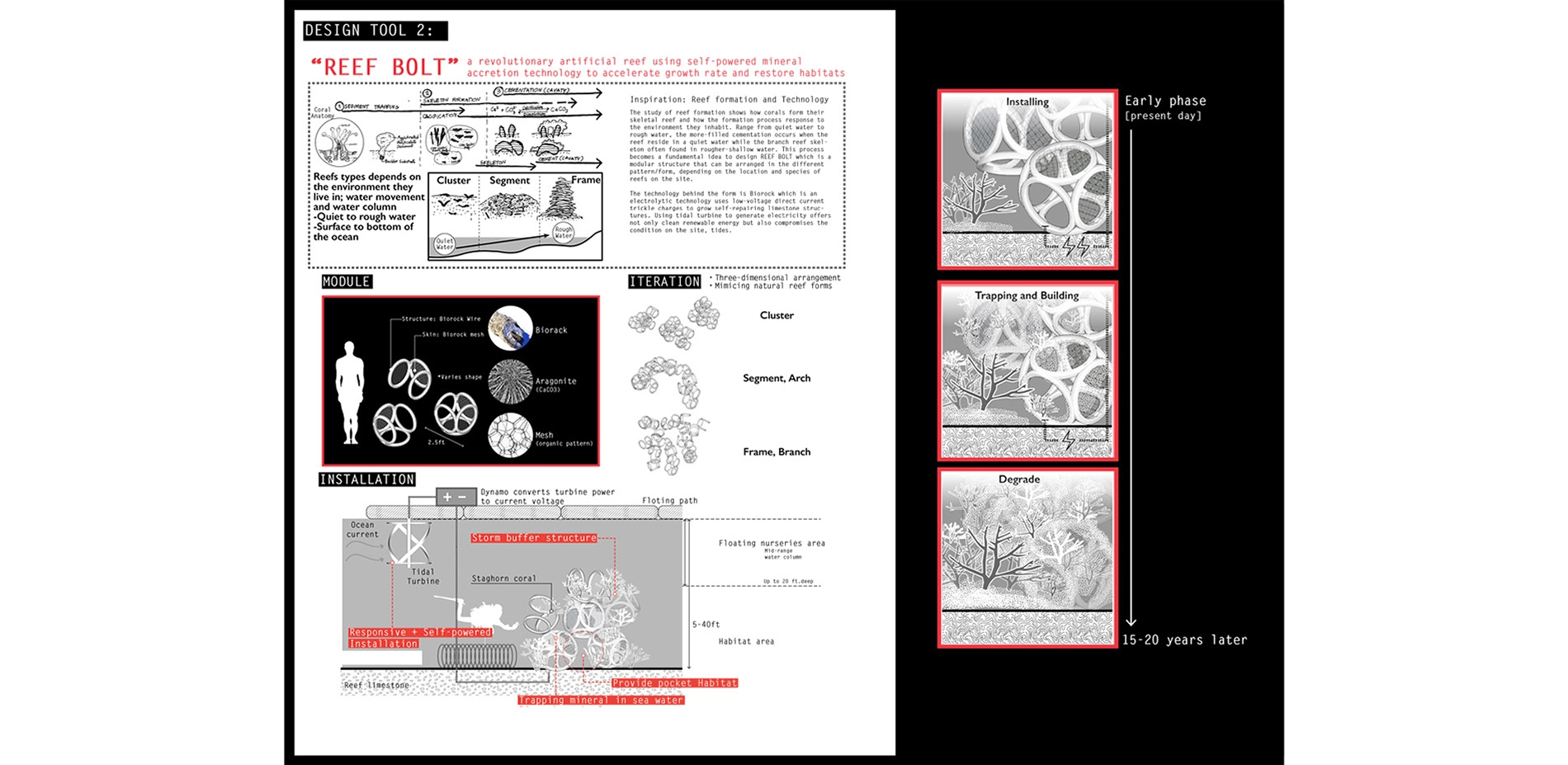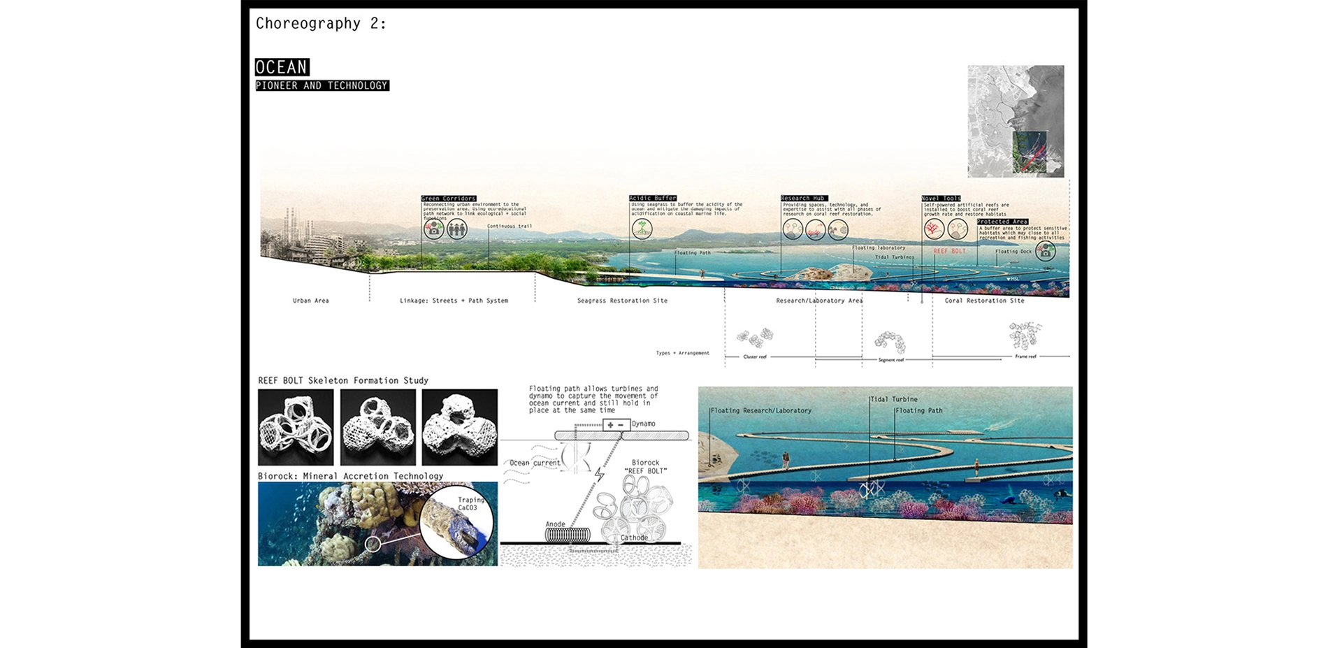 Inspired by the synchronized rhythm of healthy coastal, this proposal supports the synergetic relationship of ecological choreography. In the poetic symbiosis between system components and functions, each habitat has roles to perform to make the choreography work. They need to strive together to benefit each other harmoniously to survive in the future ocean.