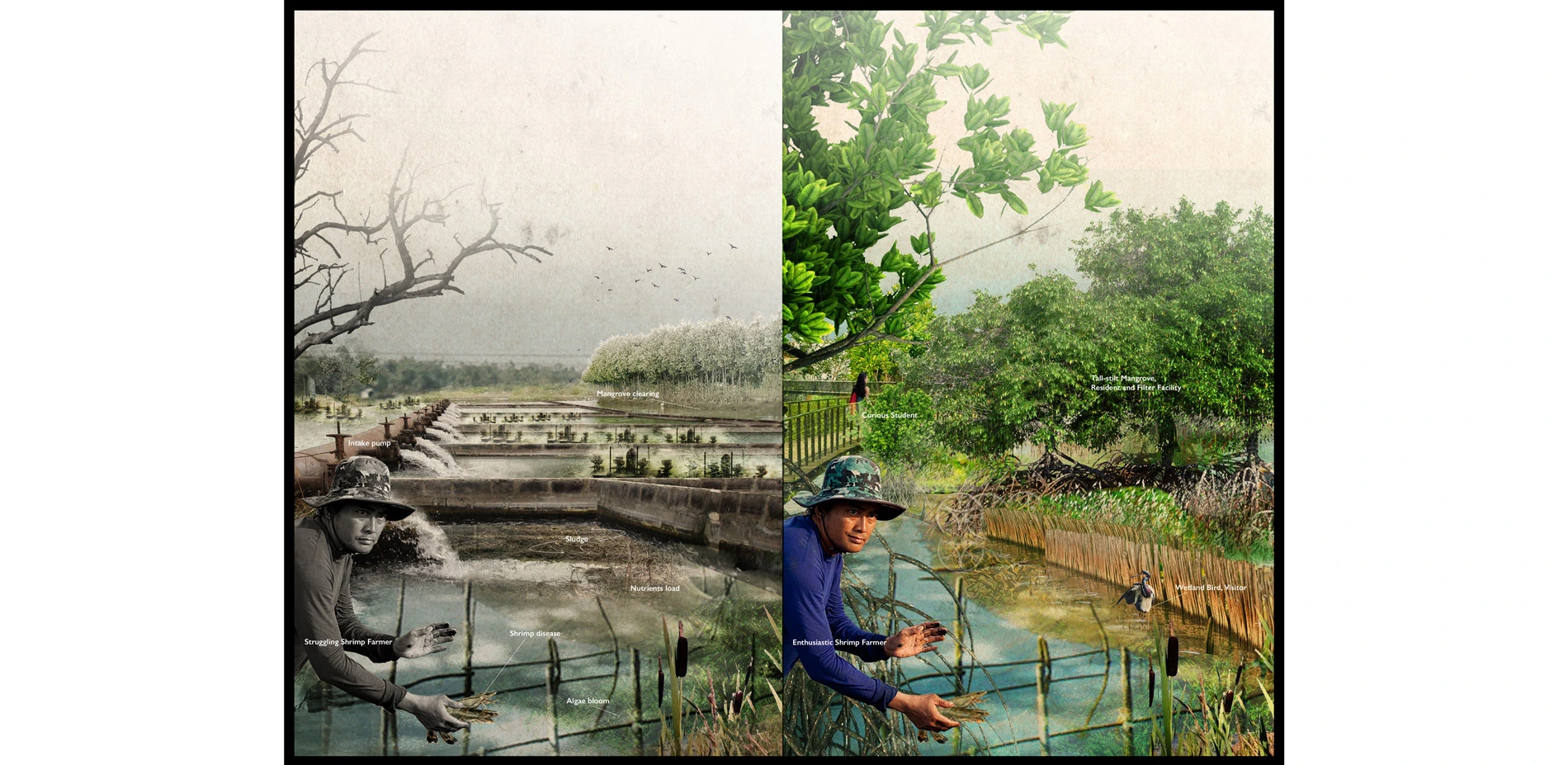 The early phase is to introduce an integrated strategy for shrimp farming. Shrimp farming will relate synergistically to the mangrove forest to create a healthier way to grow shrimp. Mangroves will be planted in an elevated area at the center of the pond where crabs and small fish live. Without using antibiotics and fertilizer, shrimp will grow deeper in the side areas. In addition, using hydrologic restoration strategies and designing with the rhythm of tides, the synergetic landscape can perform its dance with the natural forces of the ocean, in partnership. Bioremediation, species polyculture, and phytoremediation are also incorporated in the system as agents to support long-term sustainable aquaculture management. This strategy allows farmers to grow healthier shrimps, accommodate the mangrove population, and support both local economy and habitat health.
