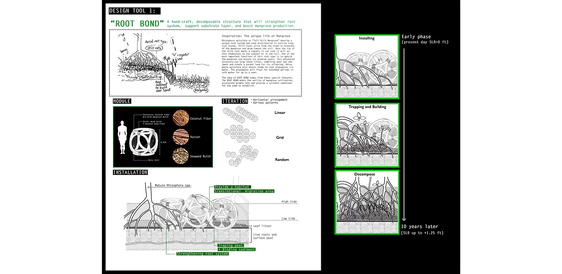 ROOT BOND is a hand-craft, decomposable structure that will strengthen root systems, support substrate layers, and boost mangrove production. It also provides a transitional migration area for mangrove habitats responsively to sea level rise. In other words, when the sea level rises more than 1 ft, mangroves which are sensitive to the amount of dissolved oxygen they intake daily, will have a chance to survive on "new" land created by ROOT BOND.
