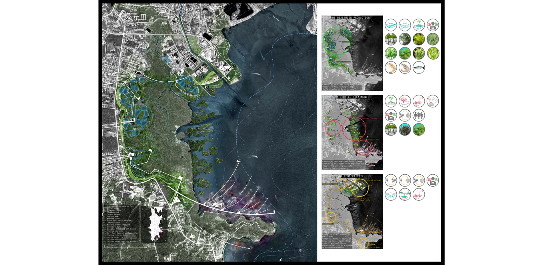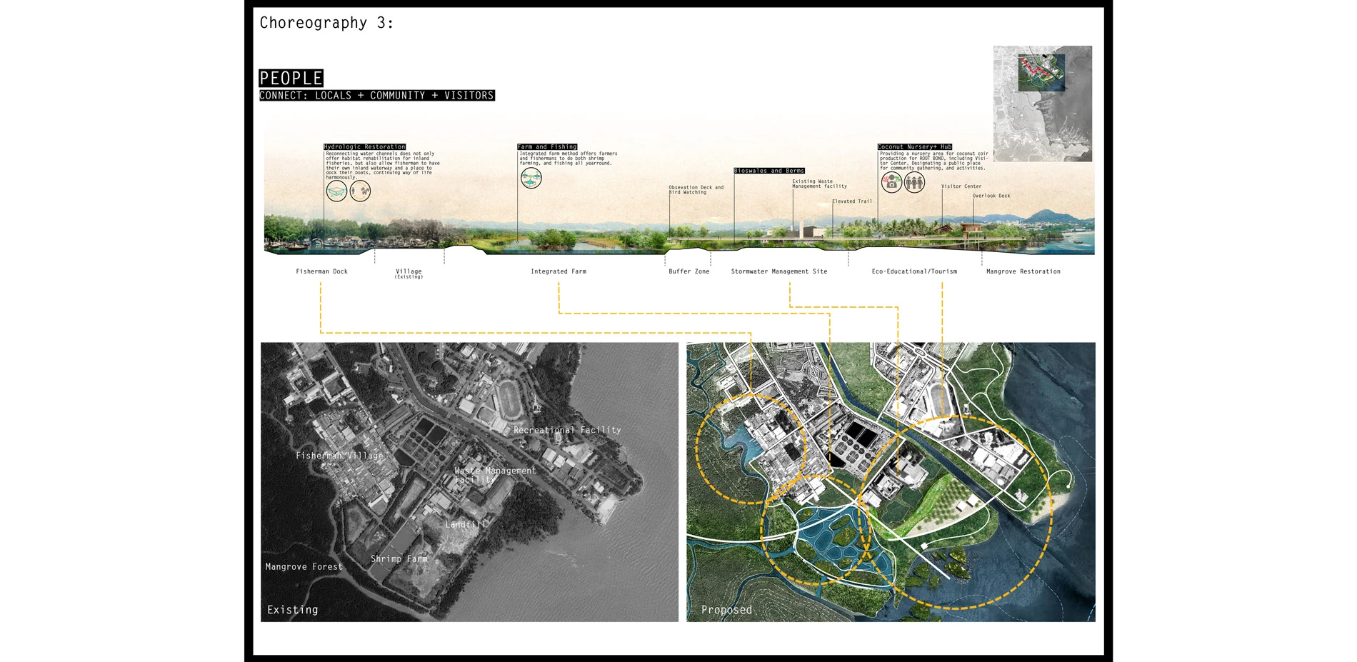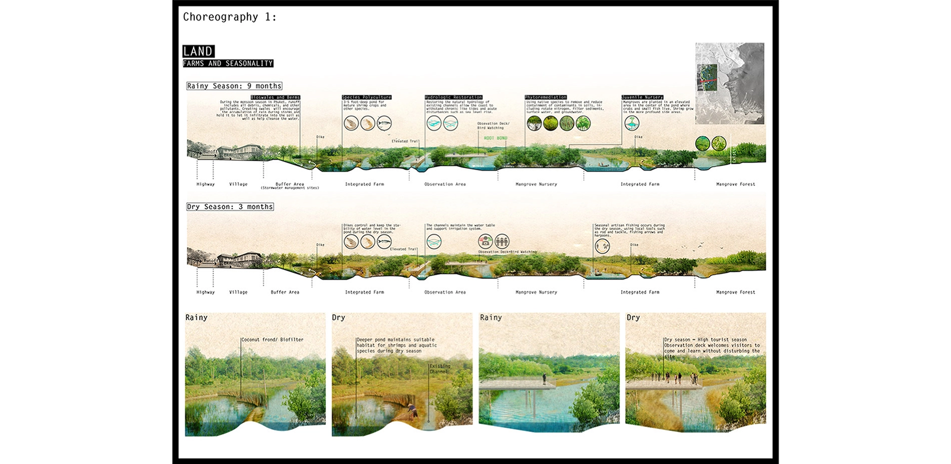 Through the transformation of the site, the synergetic landscape creates new choreographical discourses between land, ocean, and people. Integrated shrimp-mangrove farming offers a sustainable production that synchronously in response to hydrologic conditions, treatment and tools, rehabilitate species and habitats, while people, either local or visitor, cooperatively engage in the network of activities.