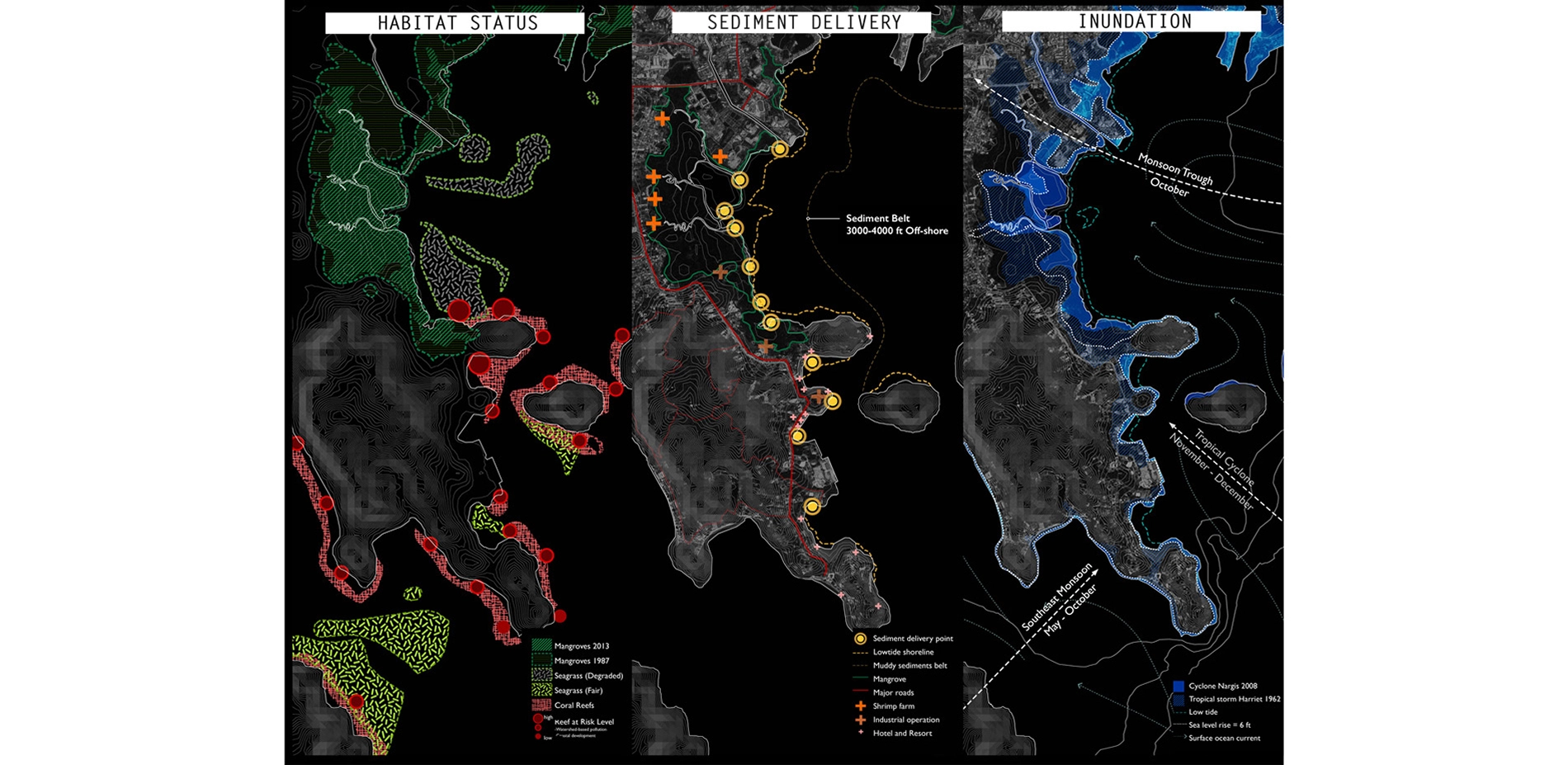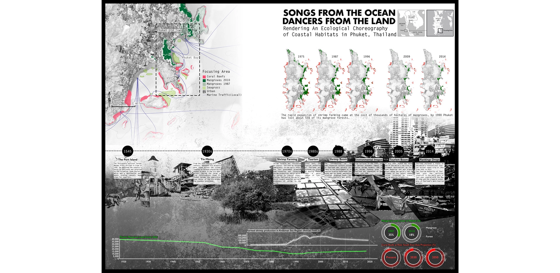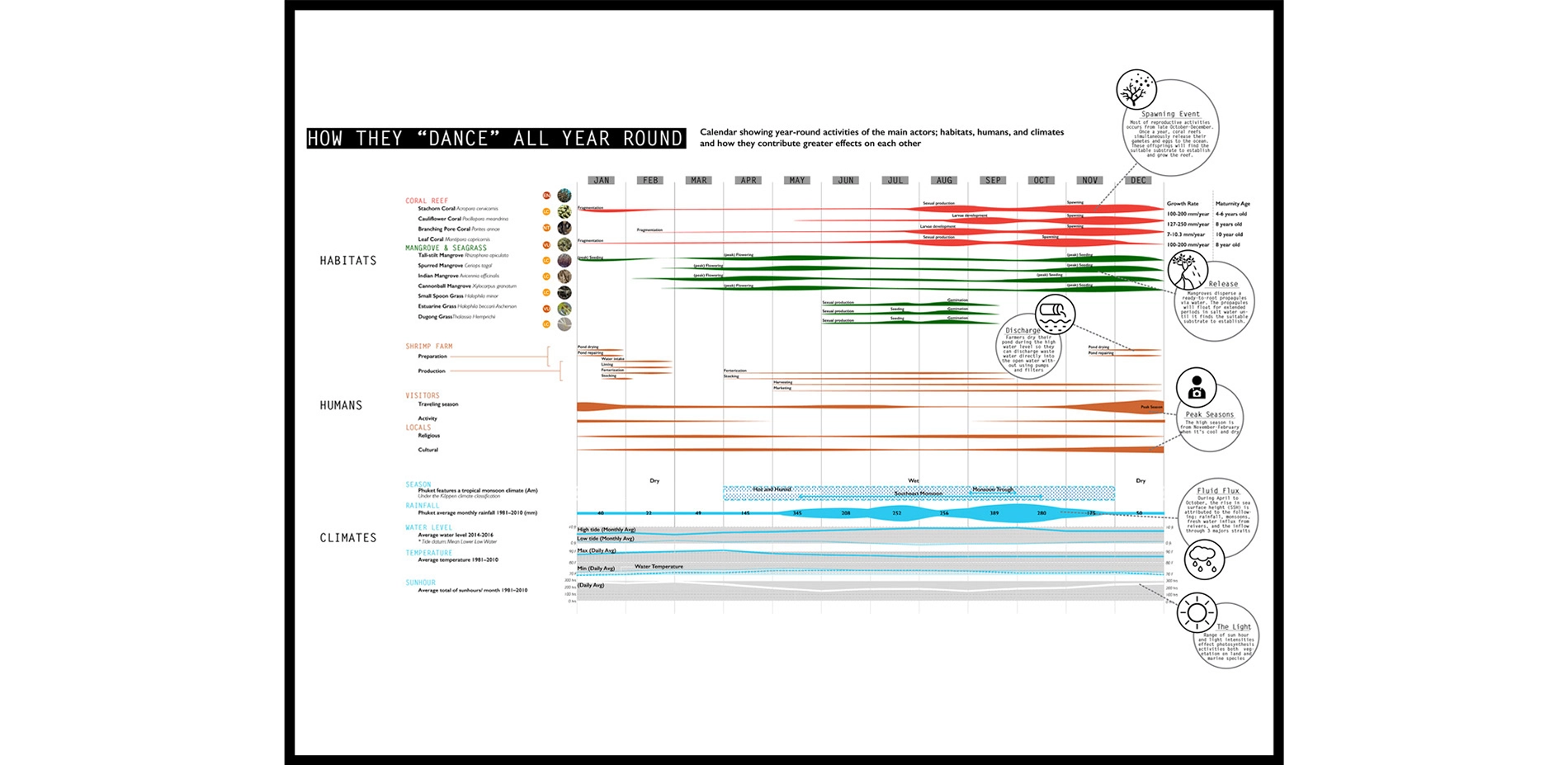 This proposal explores a synchronized ecological system in the coastal habitats of Phuket, Thailand as one intricate choreography. The design attempts to conduct the synergistic relationships between system components and functions; one habitat plays music for the other to dance. With our most vital companions at stake, this project examines a way to work together, benefit each other, and ensure the survival of our future ocean.