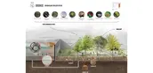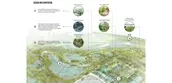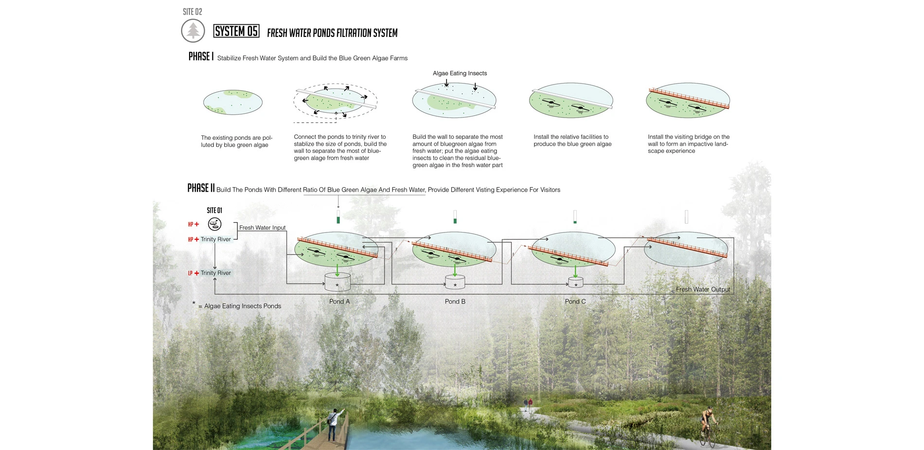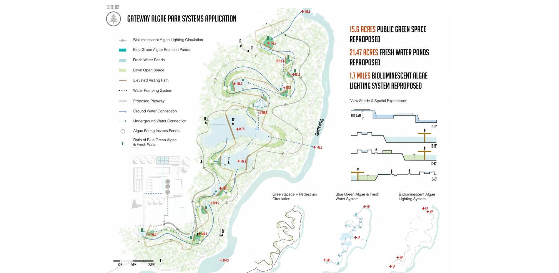 The underutilized Gateway Park adjacent to the Laboratory is proposed to connect the segmented water ponds to reform an ecological hydrology system by using the clean water that is output from Laboratory. The condition of the water would be stable once it both connects to the Trinity River and Laboratory. The flowing water would increase the size of existing segmented ponds. In order to recall the theme to use the dynamic biological system to improve the landscape, the proposed design divided the fresh pond into two parts, the fresh water pond and Blue Green Algae farms. By the walking experience from High point of the earth to the low point, the visitors will see the gradient shift of the ratio of Blue Green Algae and fresh water.