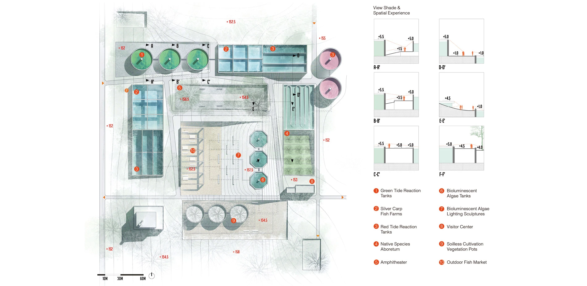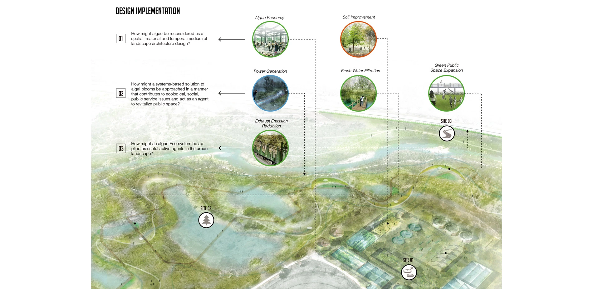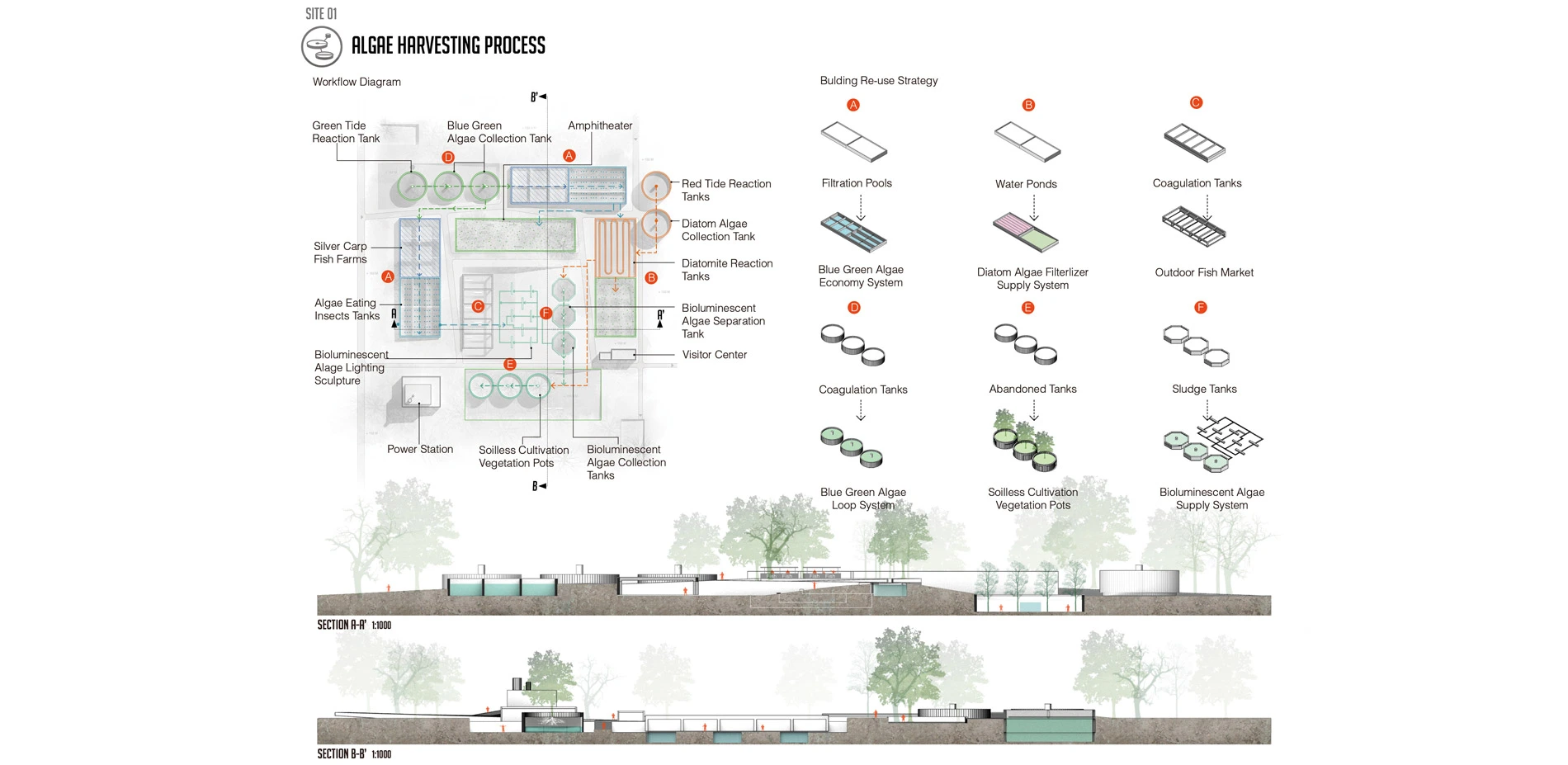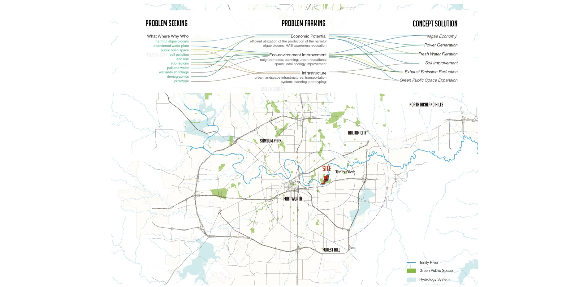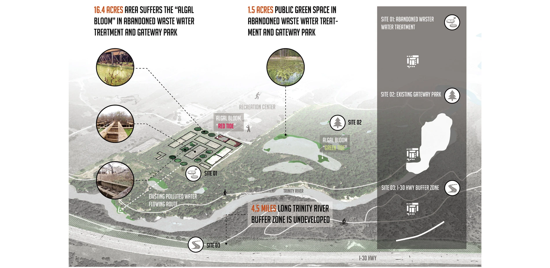 In the site, there exists a redundant wastewater treatment plant filled with algae. The polluted water runs into the Trinity River and brings harm to the surrounding natural environment. The Gateway Park (adjacent to the wastewater treatment) also evidences the algae bloom phenomenon in segmented wetland ponds. In total these two sites represent approximately 6.5 Acres of algal bloom pollution effected territories that includes natural ecologies, redundant infrastructure, and recreational facilities. Instead of simply eradicating the naturally occurring algae, this study considers how the dynamic biological algae system might be utilized through innovative design practice to reactivate the site and contribute to the health and well-being of the larger urban environment.
