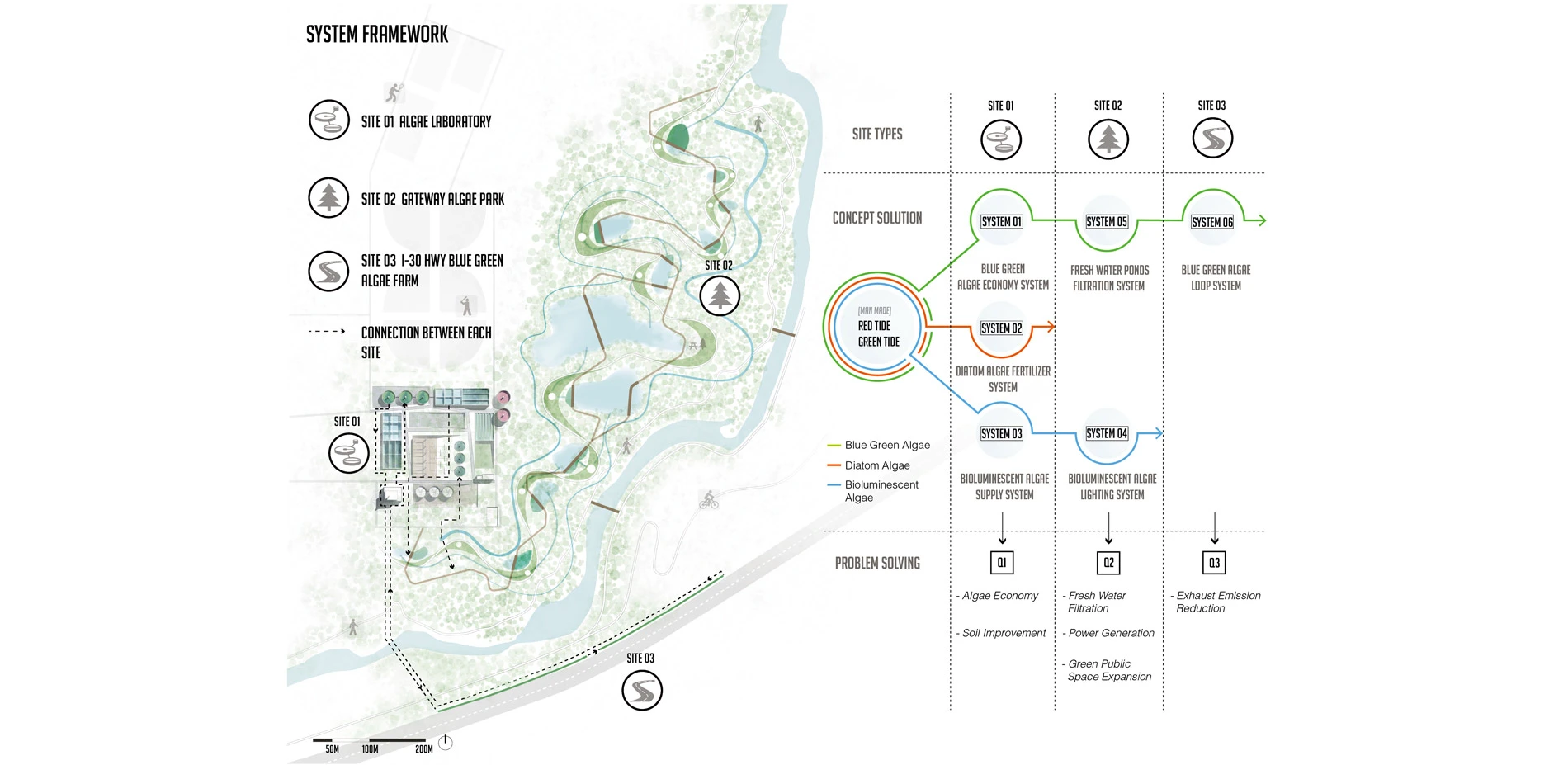 This project aspires to explore how problematic levels of algae (specifically Bioluminescent Algae, Blue Green Algae and Diatoms Algae) in waterways might be addressed through innovative landscape design strategies that move beyond reductive engineered solutions to productive spatial agents within urban environments. Healthy water bodies generally contain many kinds of algae that balance the ecological system, however, in certain conditions the balance can be disturbed by external environmental activities and weather events causing toxic algae blooms. The most common algal bloom types are the Green Tide and the Red Tide. These phenomena have the potential to be converted to improve Eco-system health and act as design drivers in the sustainable landscape. This study will focus on three case study types: the redundant industrial infrastructure (Site 01), the Gateway Park next to the redundant industrial infrastructure (Site 02) and the urban infrastructure close to I-30 Hwy (Site 03) on the site of Fort Worth, Texas, as a prototype for considering how this approach might be deployed nationally.