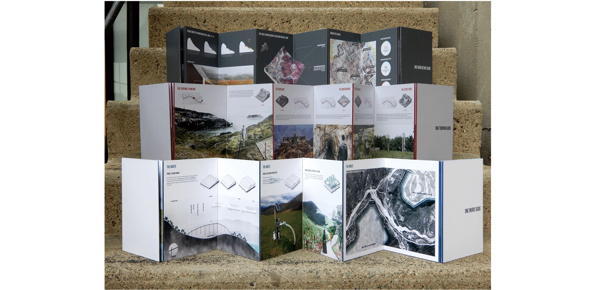 As part of the studio course we undertook a field trip to Korea DMZ and Hinterlands and talked to local residents and planners to address key aspects that could help the unification process. Food Security, DMZ Tourism and Energy Development were established s main themes to investigate. These three categories were developed in the studio with a final product of a 'guide book' to aid future residents, officials and visitors to the region. The structure of each book follows: