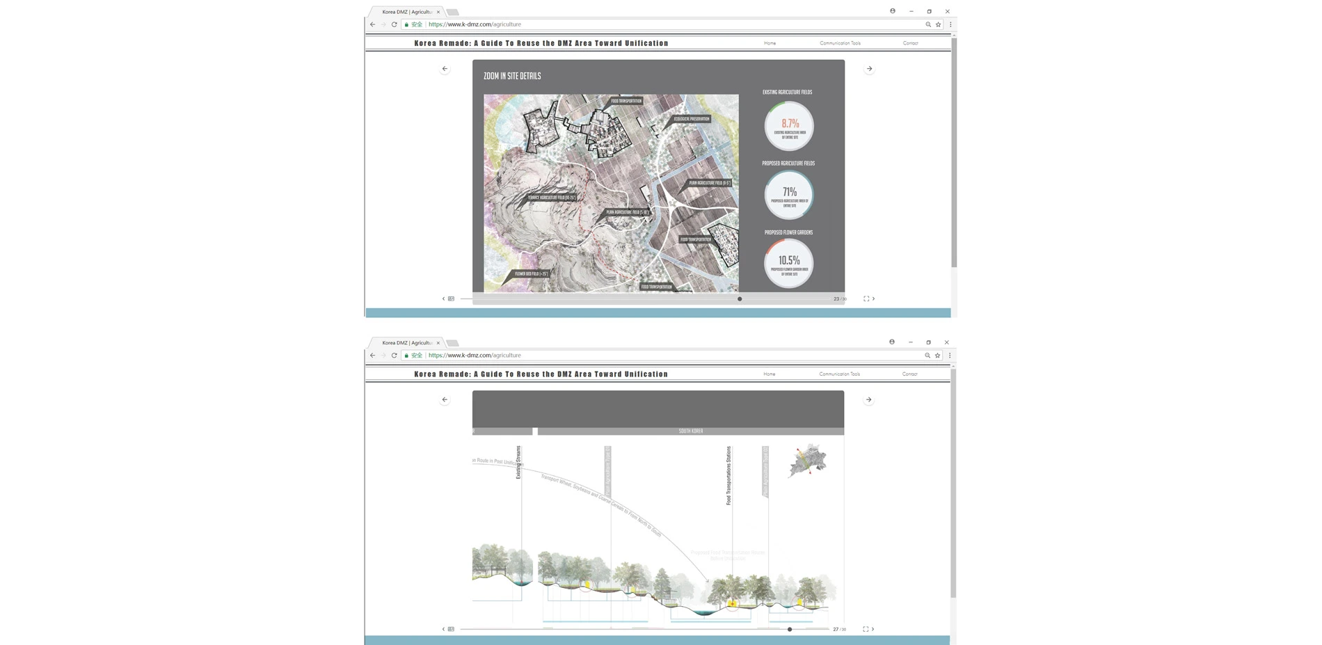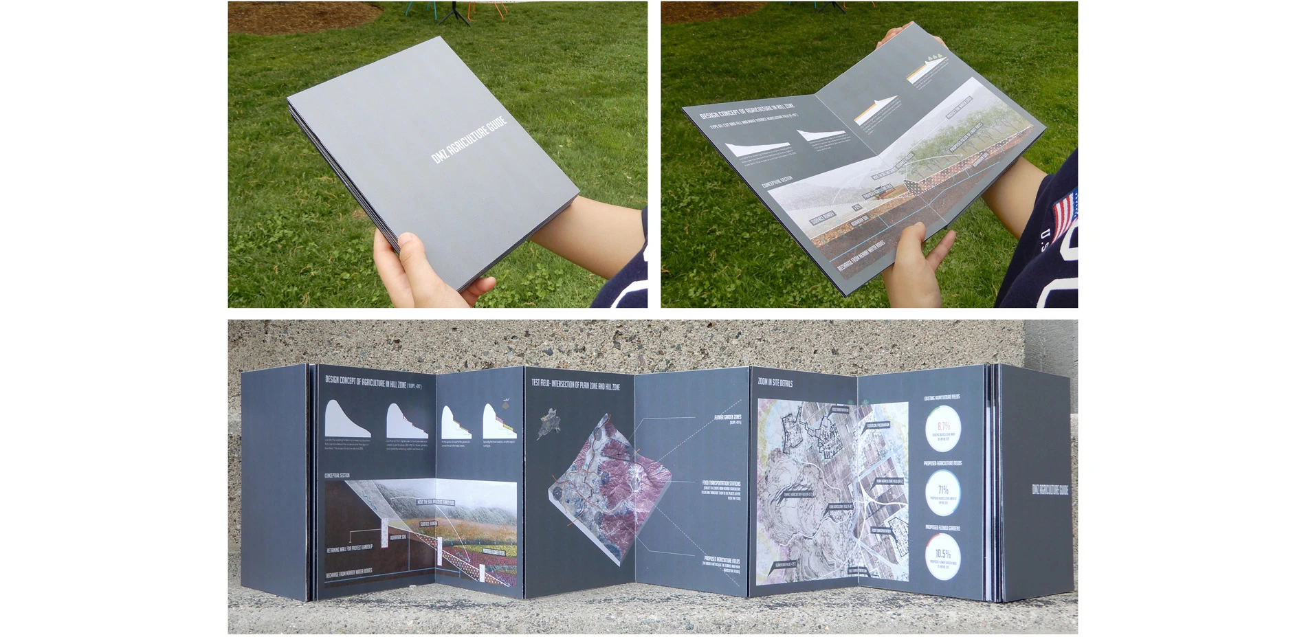 DMZ Agriculture Guide: Aims at improving food security as part of the unification of the Korea Peninsula and in using the resulting landscape as a medium to reflect local culture. Food security is one of the important concerns that will affect the development of the entire Korea Peninsula, especially within the current North. Cherwon (South Korea) and Pyonggang (North Korea) are two main existing agriculture zones that are close to the DMZ. These are 4.5 kilometers wide zones that cross the DMZ between the two cities and could be fully developed by agriculture. The connected Agriculture Zones could be reformed as a main agriculture zone of the entire Peninsula. This zone has a rich hydrologic system and varied elevation changes. The Northern Part is steeper than the South and soils are different. The Guide Book proposes two types of agriculture: Plain Agriculture Fields and Terraces Fields.