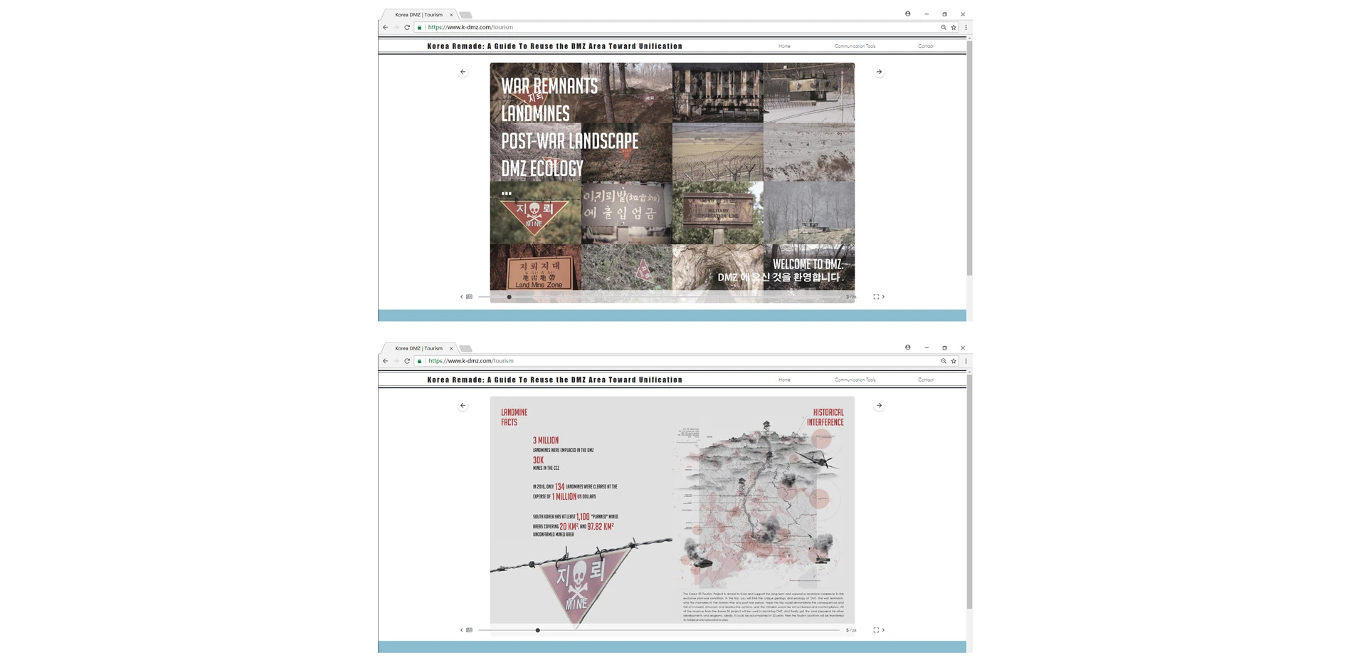 DMZ Tourism Guide: For unification, the many millions of landmines need to be cleared before any development can occur. There are about 3 million mines embedded in the DMZ, while in 2016, only 134 mines were cleared at the cost of 1 million US dollar. In order to support this expensive and long-‐term process, The proposed design it to introduce Dark Tourism to this exclusive post-‐war condition. Dark Tourism is defined as tourism traveling to places that are historically associated with human suffering and deep tragedy. Dark Tourism locations, such as the former Chernobyl Nuclear Facility in Ukraine and the camps of the Second World War in Germany and Poland, demonstrate the consequences and toll of immoral, inhuman and destructive actions. However, at the same time, Dark Tourism generates and provides the means and resources to address the future occupation of such places.
