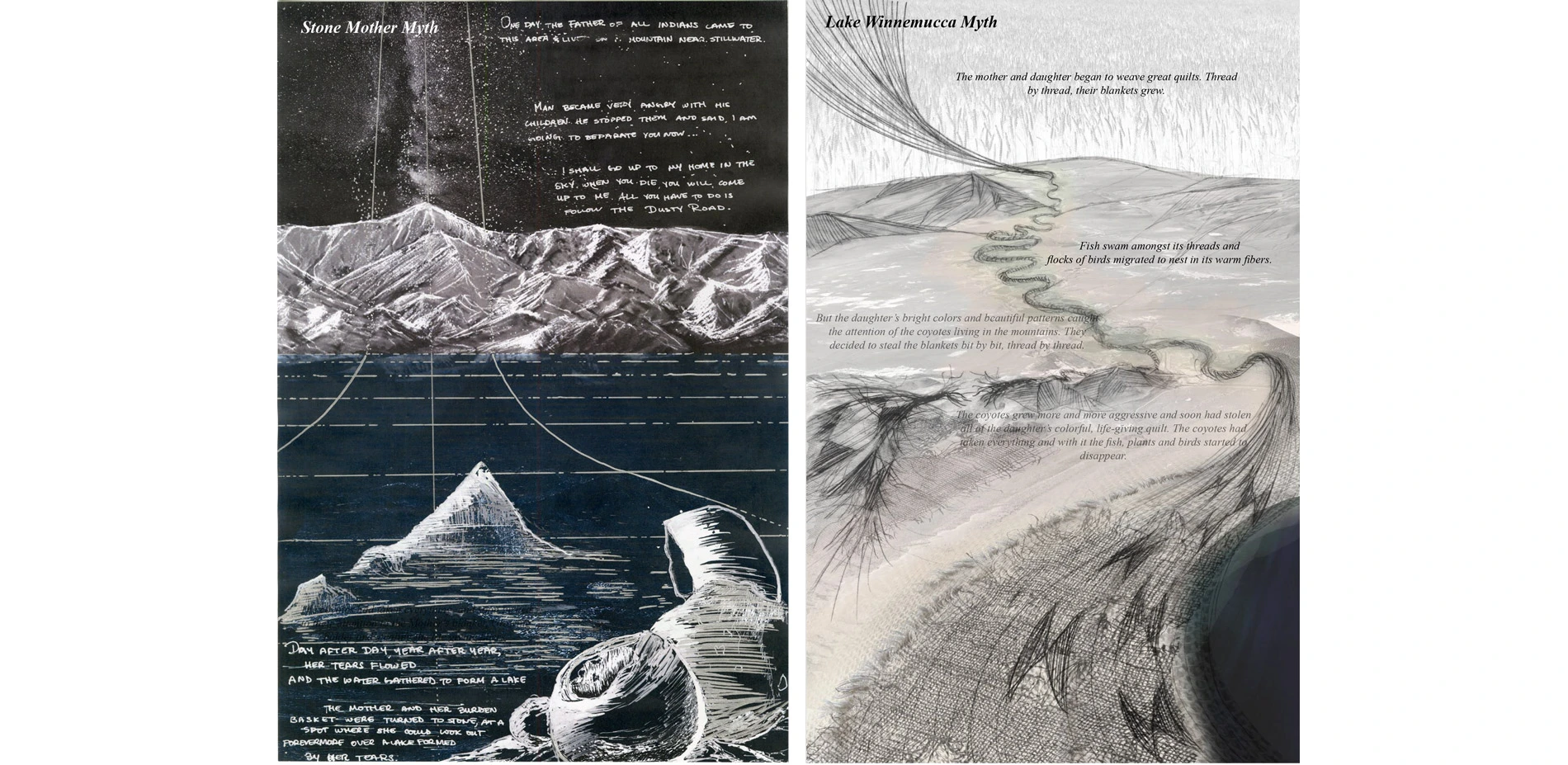 Myth, Memory, and Landscape in the Pyramid Lake Paiute Reservation was part of landscape architecture studio taught by Prof. Danika Cooper, which challenged cultural myths of the desert as infertile, barren, and unproductive. Our project explored the relationship between indigenous histories and cultures, the "outsiders" in the surrounding communities of Reno, Sparks, and Fallon, Nevada, and the desert ecology. Our goal was to create a didactic landscape installation that would teach the "outsider" about the Paiute community, their history, and the surrounding desert ecology.