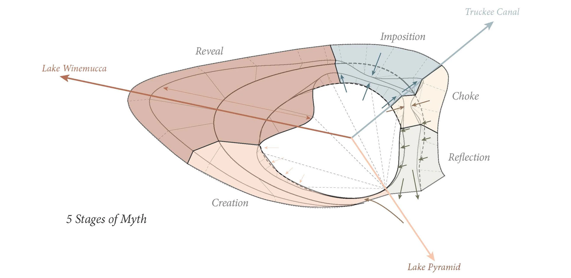 Myth, Memory and Landscape in the Pyramid Lake Paiute Reservation uses Landscape Architecture as an instrument, demonstrating the power of design to transform communities and perspectives in a meaningful way. The Landscape Installation uncovering the story of the untold story of Lake Winemucca is located at the once confluence between Pyramid Lake and Lake Winemucca. This project uncovers new methods for engaging with indigenous culture and hardships when one may not be from that community or shared in an experience. This design proposal provides a means to push the boundaries we have as designers, existing somewhere between the insiders, the Paiute, and the outsider, Reno and non-tribal visitors. From our design perspective, the land's incredible power and scale was not a place for agriculture or production, instead it held a mysticism and calm reverence, and this aspect drove the design program. Our program uses landform to manifest a new myth that engages the outsiders, encouraging them to journey into the landscape and discover the Paiute's rich history and immense struggle to this day.