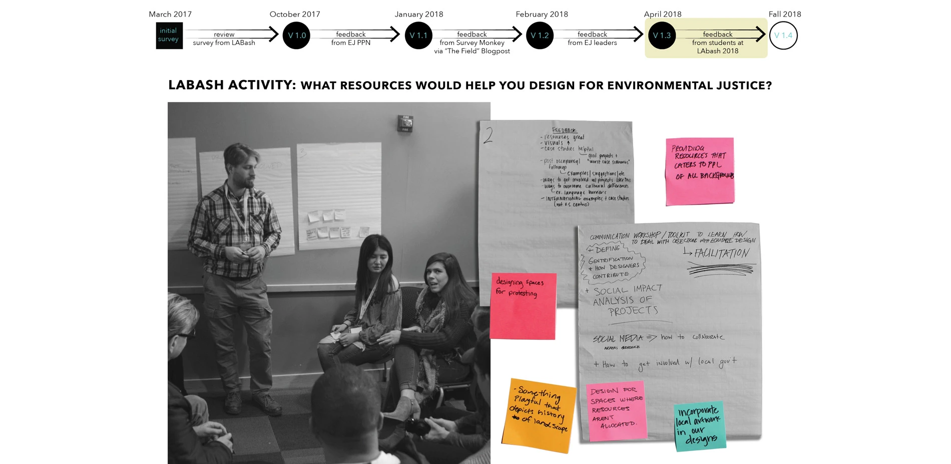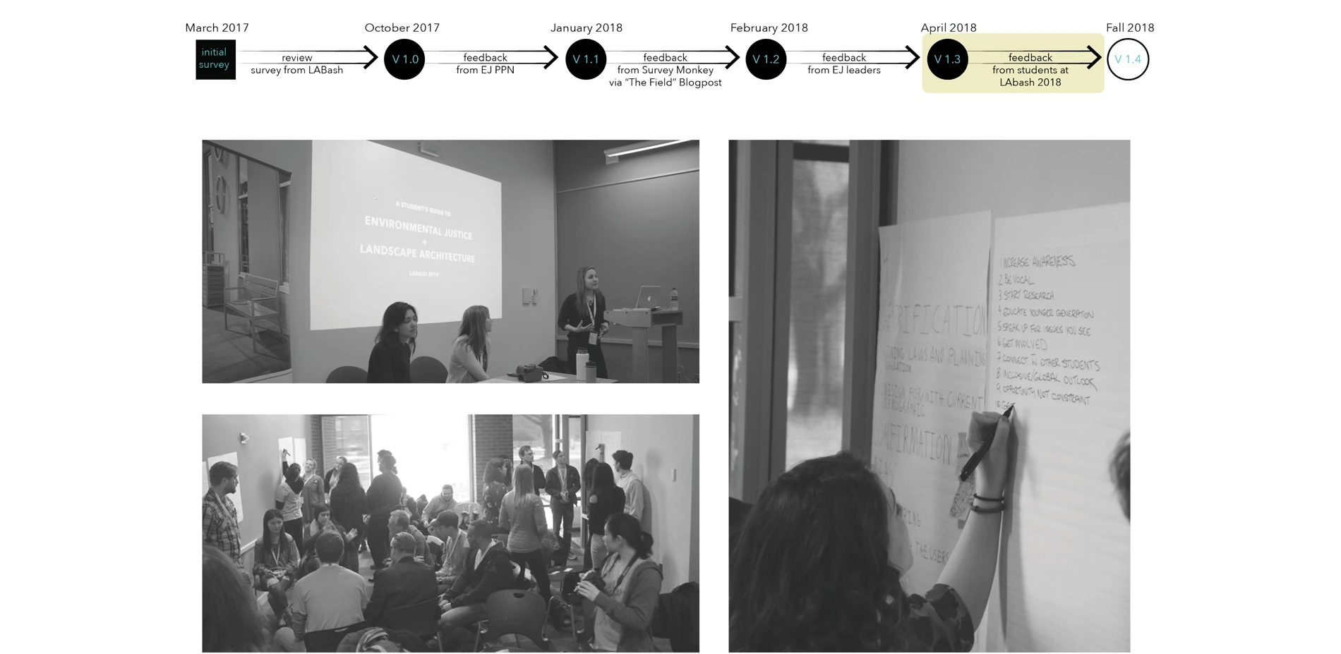 We released "A Student's Guide to Environmental Justice" Version 1.3 at LAbash 2018 through an interactive, participatory presentation with over 40 students of landscape architecture from around the country. We first presented an overview of the guide, and then gathered students into small groups and asked them to discuss critical questions about landscape architecture and environmental justice. Near the end of the presentation, we asked them what they would like to see in a guide about environmental justice. After the presentation, we emailed each student the guide and a link to a survey monkey where they could give feedback on the guide. In addition to the presentation and distribution at the LAbash conference, we also had the guide on display and a sign-up sheet to receive it digitally and complete a survey to give feedback at the Rising Urbanists Conference put on by the student chapter of the CUNY-ASLA and the Design Futures Public Interest Design Student Leadership Forum at Washington University in Saint Louis.