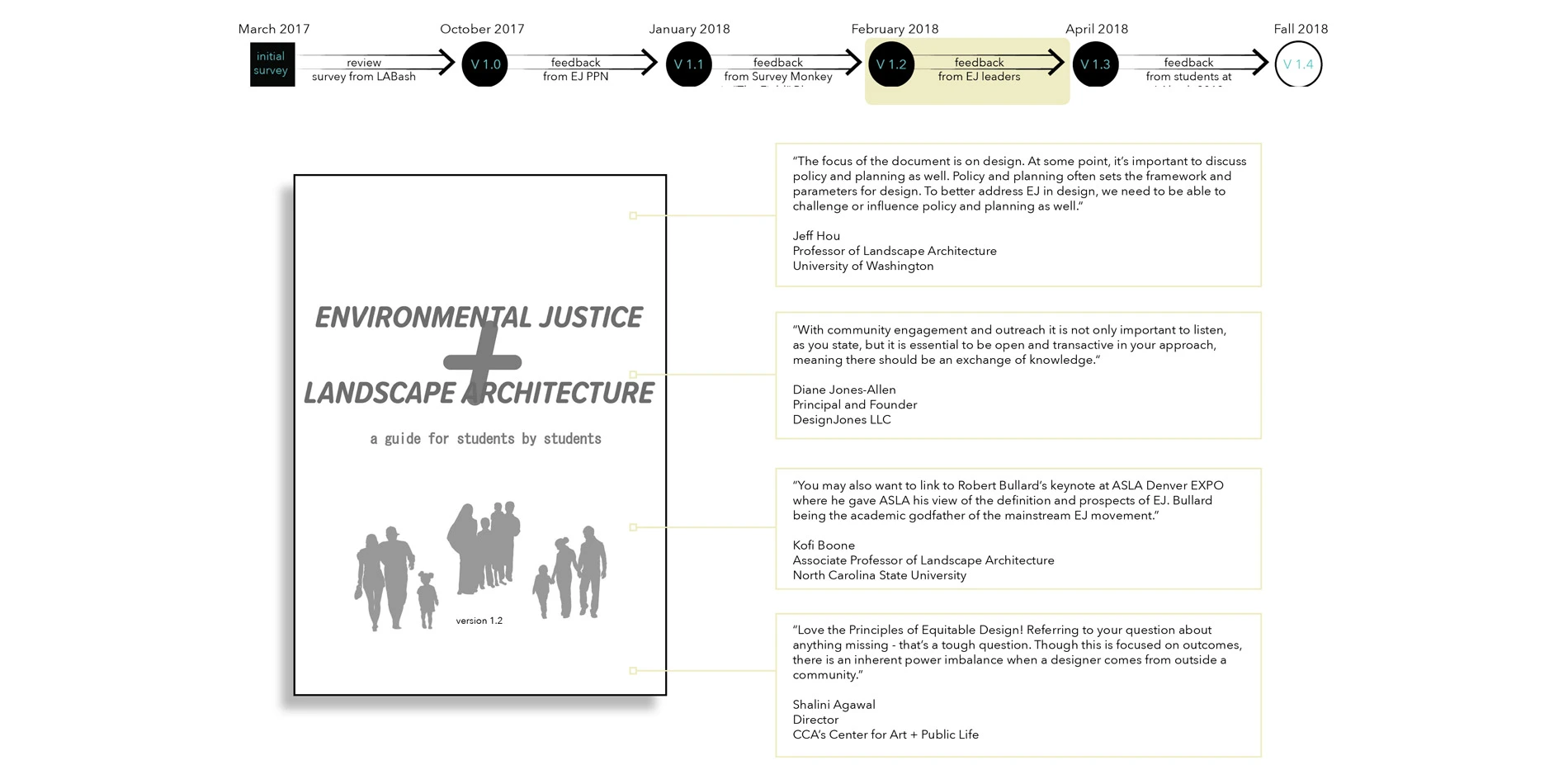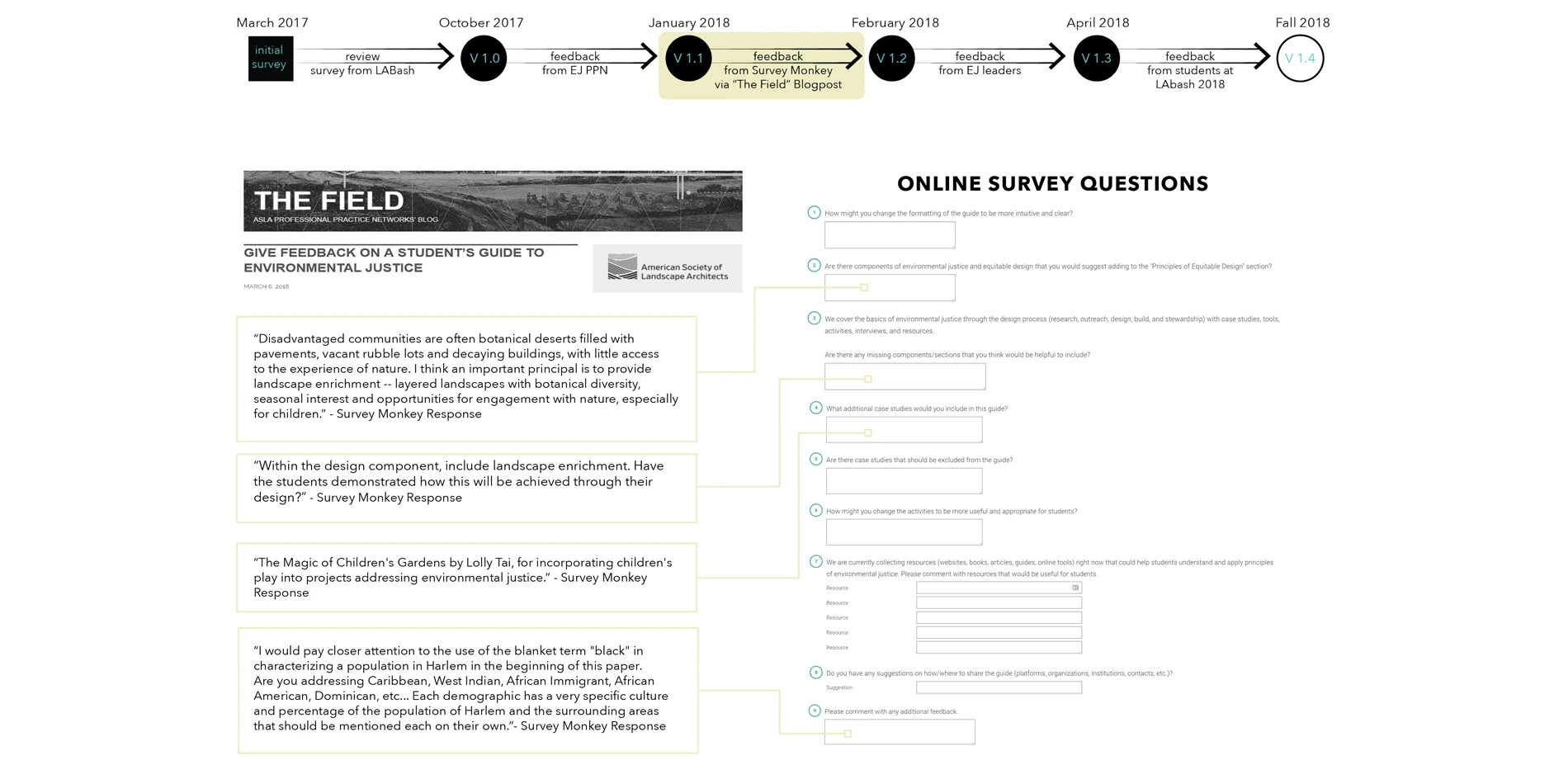 We first received initial feedback and edits for Version 1.0 from fellow members of the Environmental Justice PPN. After updating the document with their suggestions, we then sent out Version 1.2 of the guide to over 15 academics and professionals working at the intersection of landscape architecture and environmental justice for feedback. After another round of edits, we sent the guide to the all the members of the ASLA's Environmental Justice PPN along with an online survey to receive feedback. Though the PPN, we had a phone call design review where we received live feedback from PPN members, and wrote a post for the ASLA's "The Field" blog that linked to an online survey to solicit feedback from an even wider audience.