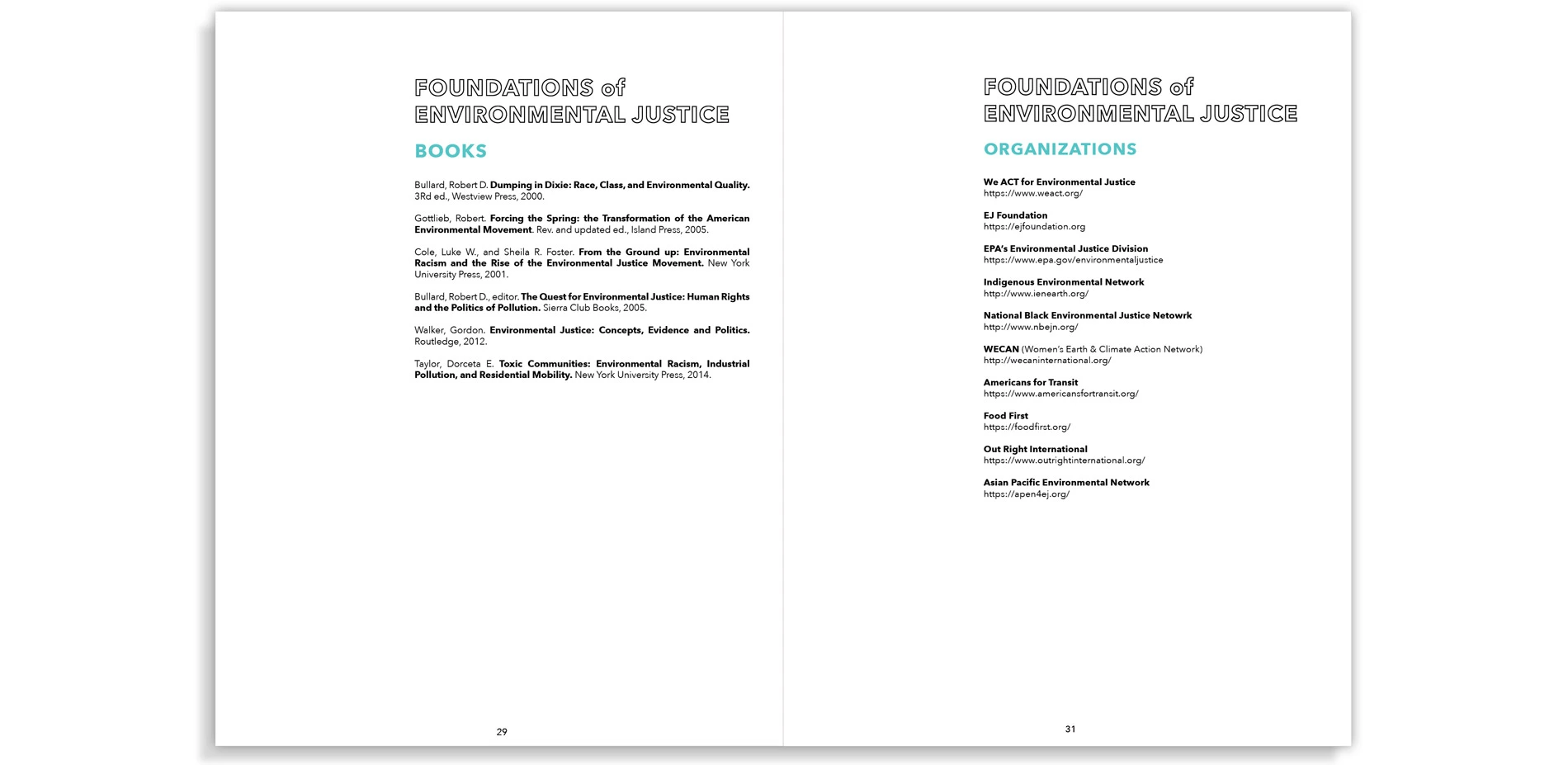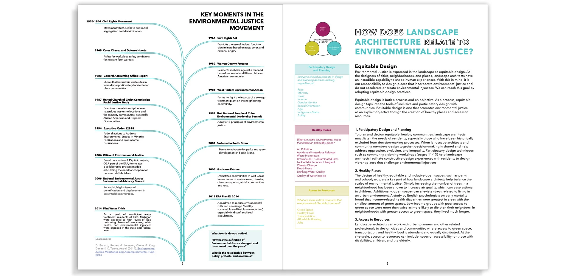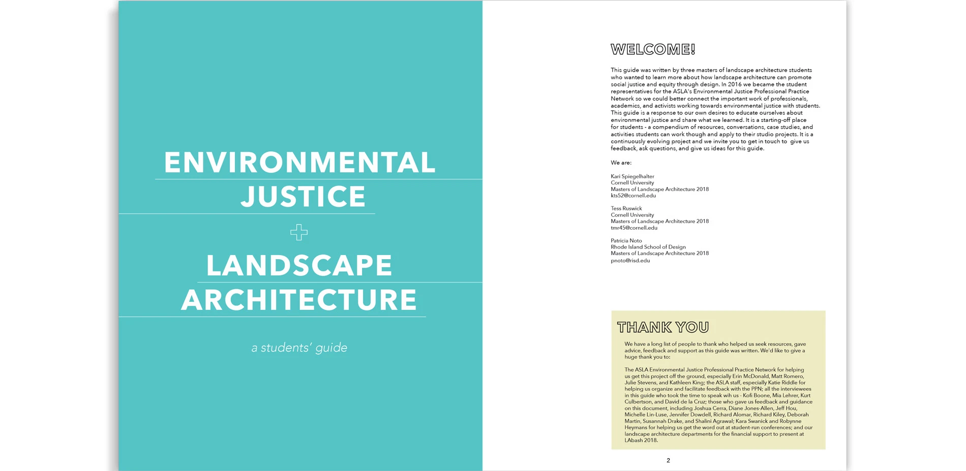 What is environmental justice? How does it relate to social justice, environmental racism, community health, and equitable design? As designers of places and cities, what is our responsibility to work towards greater equity? As three students of landscape architecture, we found these questions weren't always being addressed in our coursework or studio projects in school and are critical for our profession to address. This guide is a response to our own desires to educate ourselves about the intersection of landscape architecture and environmental justice and share what we learned with our peers. It is a starting-off place for students - a compendium of resources, conversations with experts in the field, case studies, and activities students can work though and apply to their studio projects. While we can't provide an exhaustive examination of environmental justice and design, we have filled the document with links to online resources, tools, and suggestions for further reading on the foundations of the environmental justice movement. We see the guide as a launching pad for students to learn more about designing for equitable places and a place for students to begin to address environmental justice concerns in their design work.