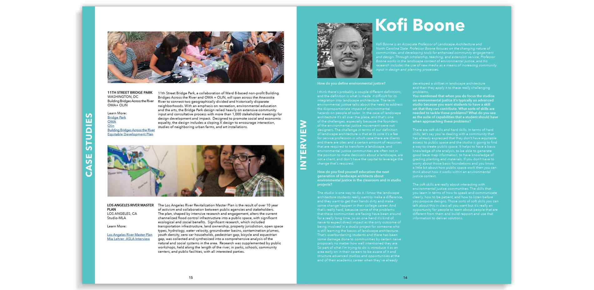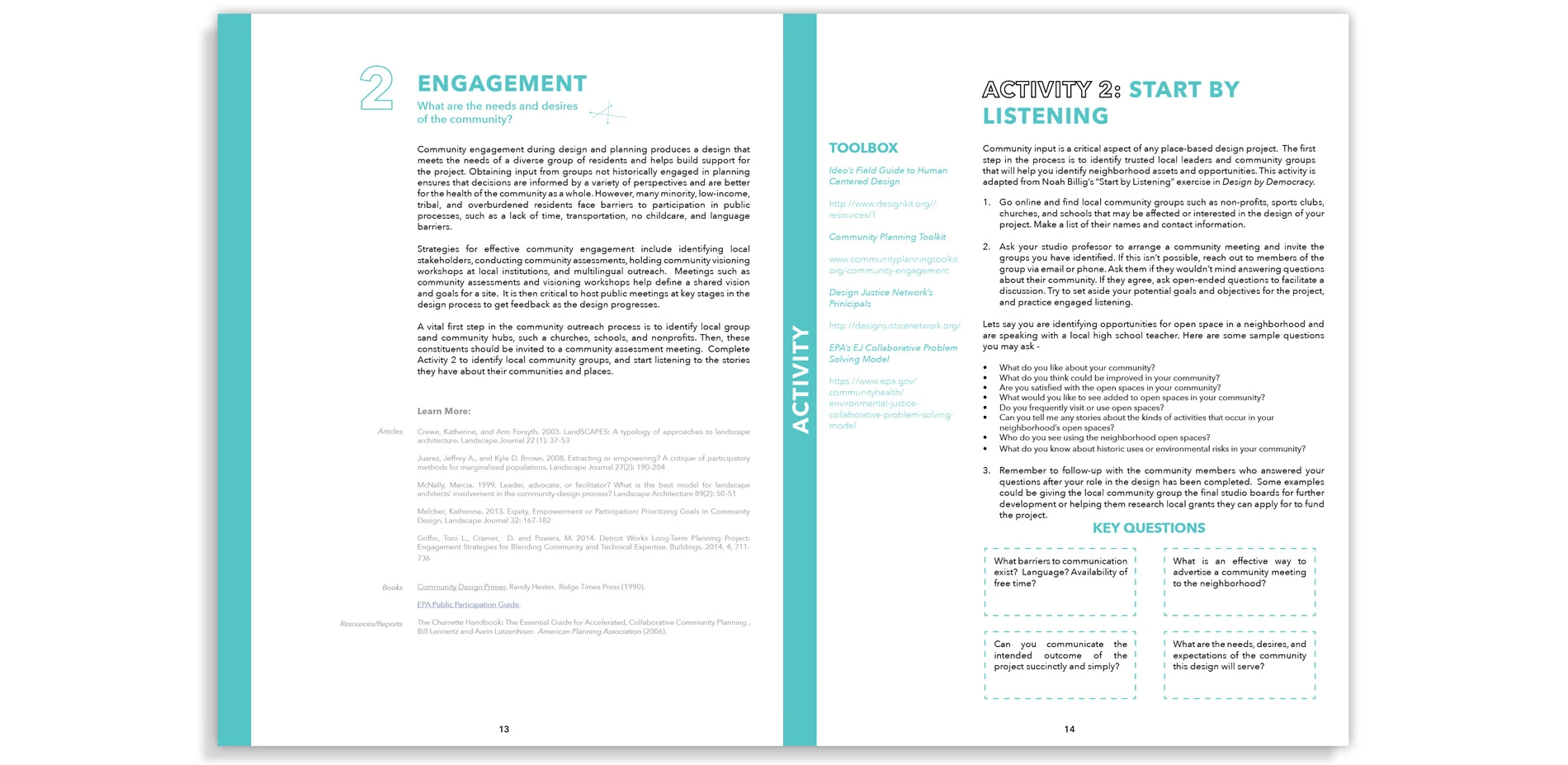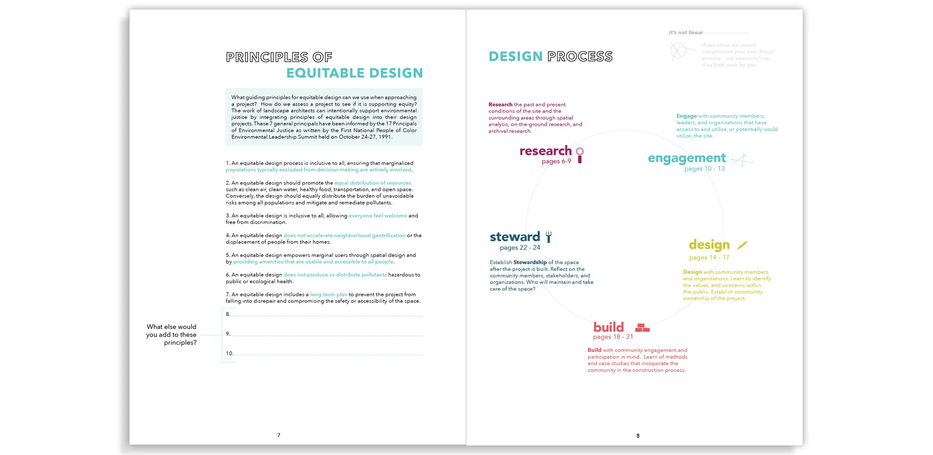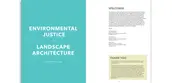 A Student's Guide to Environmental Justice Version 1.3 leads students of landscape architecture through a class studio project while viewing the design process through the lens of environmental justice. It helps prepare students for a career that keeps in mind equity and designing for equitable communities. We lead students through the studio design process, which we define as research, engagement, design, building, and stewardship. Each step in the design process has case studies, interviews, further resources, and activities so students can critically investigate environmental justice issues relating to their design project, integrate it into their studio work, deepen their design, and ultimately make it more equitable. The full version of the guide can be read online here.