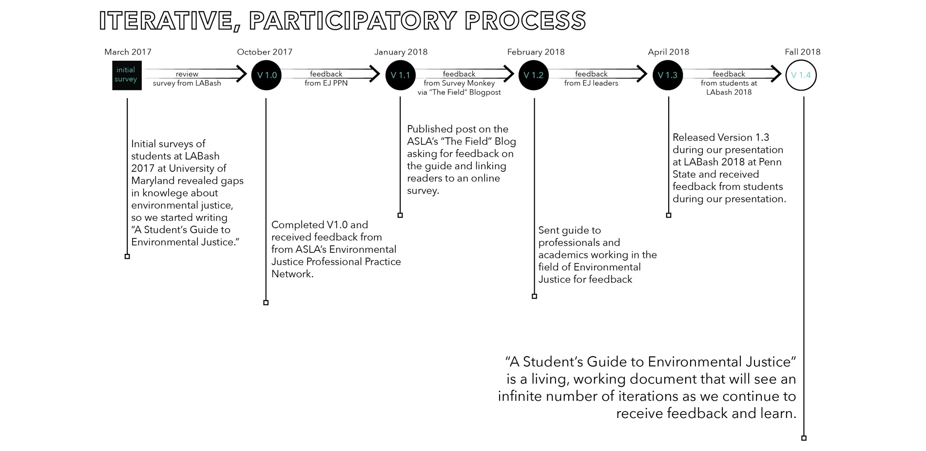 The document was written using the tools of participatory design, and is a living, working document that has already seen several versions and has infinite potential to evolve. This project began in fall of 2016, when we became the ASLA's Environmental Justice Professional Practice Network's student representatives. Our goal was to better connect the important work of professionals, academics, and activists working towards environmental justice with students of landscape architecture. In spring of 2017 we attended LABash at University of Maryland, a conference for students of landscape architecture from around the country. We surveyed students about their understanding of environmental justice, and the results showed that many students didn't know what environmental justice was – they frequently confused it with environmental issues, such as pollution and stewardship of natural resources. Our survey also asked about how they receive information they integrate into their studio projects, and we found that many students use summaries of design techniques and short overviews of topics. To give students a better understanding of environmental justice, we began writing Version 1.0 of A Student's Guide to Environmental Justice. Over the summer, we began compiling resources, researching, writing, and interviewing, and created "Version 1.0" of the guide.