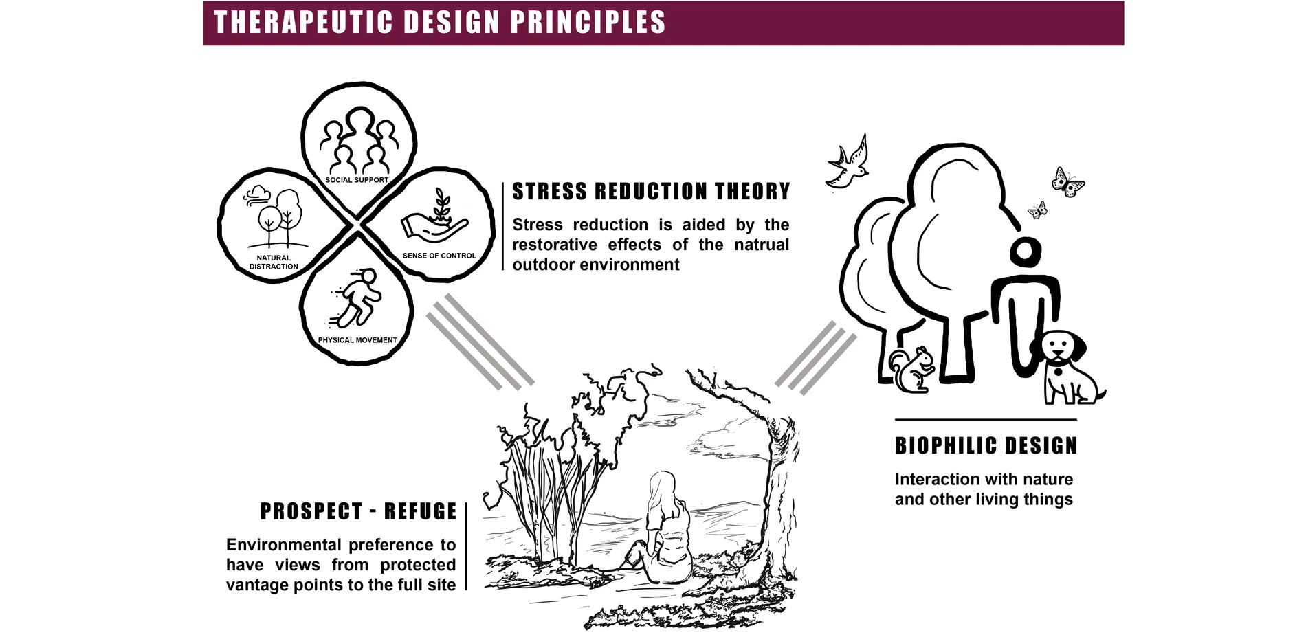 Theories from other fields of practice were adapted to the project to better understand the prison environment. For example, we applied therapeutic garden design principles typically employed in healthcare settings while maintaining sightlines for security. As humans have an innate attraction to the natural world and need contact with natural features for survival, biophilic design principles were also applied to the site with psychological stress in mind. The children's garden provides pockets of native vegetation that attract birds and butterflies, mimicking the native Iowa landscape. As the mothers and their children can experience stress in this environment, we applied principles from environmental psychology such as Roger Ulrich's Stress Reduction Theory to program outdoor spaces inclusive of all ages. The stress reduction theory emphasizes four factors that help in reducing stress: (1) a sense of control, (2) social support, (3) physical movement and (4) positive natural distractions. These factors were directly applied to the site in the form of a walking path, an open lawn, a playscape and a grove of aspen trees. To design spaces that were inclusive of all ages, we employed the landscape preference theory where people prefer a landscape that invites exploration without the fear of getting lost. The "conversation grove" employs the prospect-refuge theory to provide opportunities for perceived security and sense of control by creating pockets of refuge composed of aspen trees. This space evokes a sense of security necessary for healthy psychological functioning; it is critical to have access to spaces that enables people to be able to see without being seen. The ambient noise from the rustling aspen leaves offers a natural distraction and allows for more personal conversations.