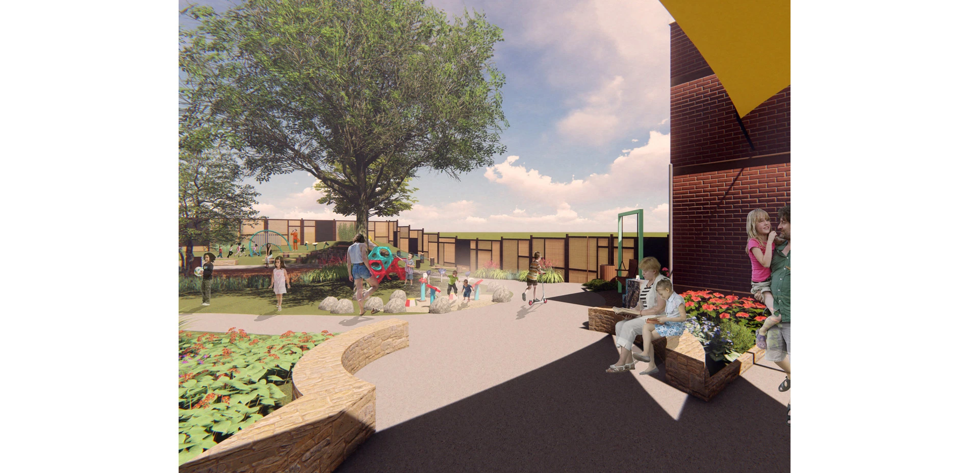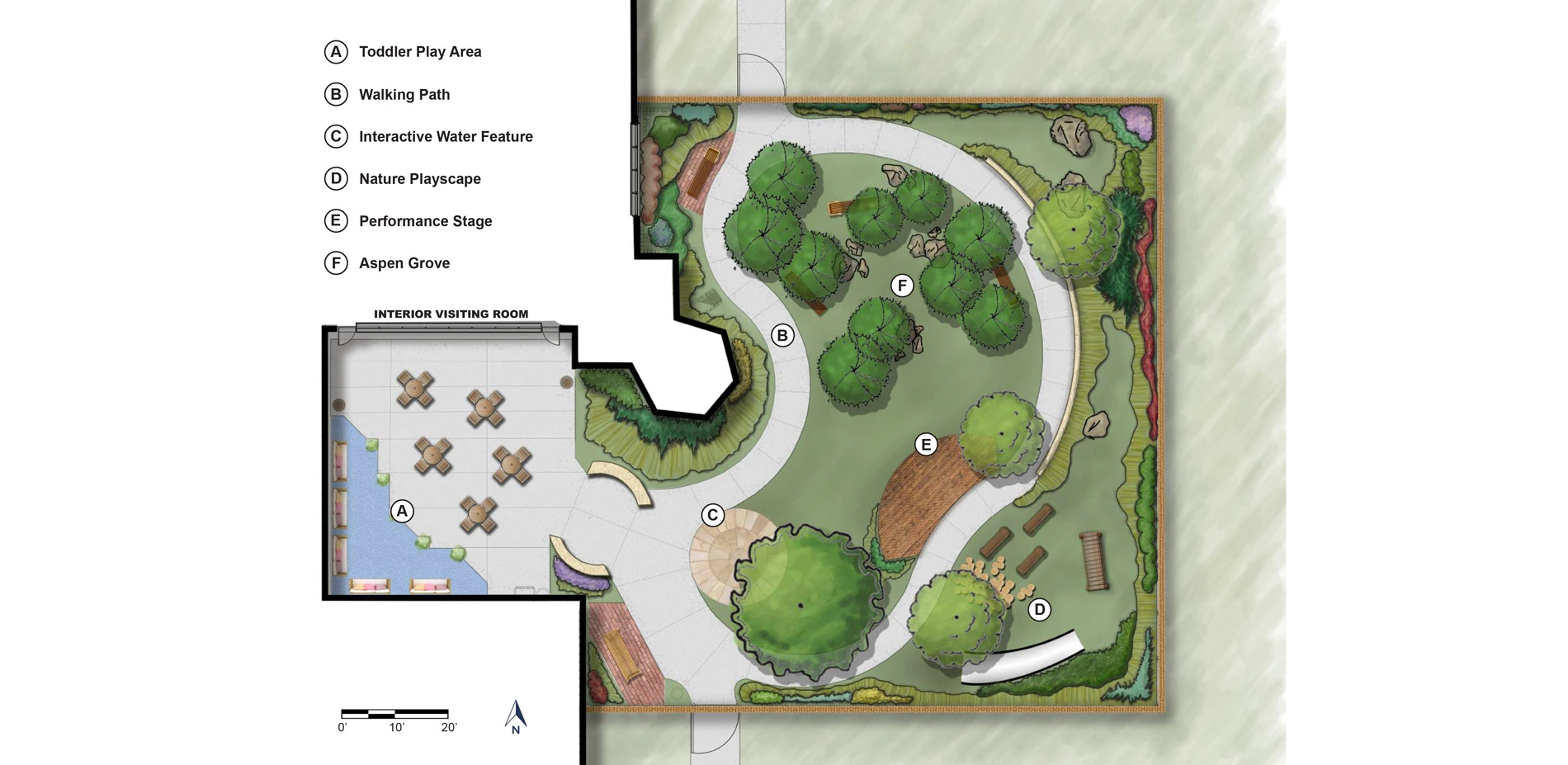 Construction of the proposed design began on April 2 of this year and will be complete in early June (we would like to submit updated photos of the completed garden if possible). The garden's proposed programming supports physical activity and mental rehabilitation. The design includes a natural playscape, an open lawn, a conversation grove, and a walking/tricycle path. The nature playscape provides opportunities for co-play between mothers and their children. This space includes several play structures and interactive musical instruments. Materials range from concrete, turf, modeled plastic, logs and wood, water, and plants. An open lawn allows for social interaction as well as for unplanned activities such as yard games. The materials used here are turf and a variety of ornamental plants. The conversation grove of aspen trees allows for an opportunity to experience natural distractions individually and through private conversations. The aspen grove can also be a retreat from the more active children's nature playscape. Materials include aspen trees, wood and limestone benches, a variety of plant types, and sculptures. The required fence was the most challenging aspect of this project. Multiple design iterations led us to a combination of wood and metal panels with chalkboards. The "backyard" sense of place that this fence contributes to is a great improvement over the chain-link and razor-wire fence perimeters that define enclosure throughout the institution. Chalkboards encourage people to interact with the fence, while small apertures in the enclosure allow the women an opportunity to show their families where they live and work while inside the prison building.