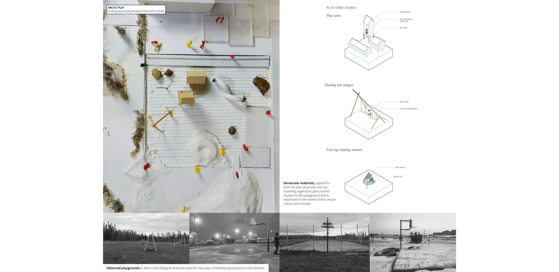"Thermal Thresholds: Education and Play in the Arctic" creates a new school and learning landscape for Minto, a 250-person Athabascan community in interior Alaska. By using seasonally dynamic landscape and architectural strategies, the design challenges the conventional building threshold used in Arctic climates and connects native Alaskan children to their surrounding environment. The design considers the extreme climate as a programmatic opportunity, creating play and learning spaces out of thoughtful spatial layers. The collaboration between landscape architecture and architecture students allowed this principle to manifest in the design of plantings, play structures, topography and ground manipulations, as well as wall sections and building design, generating new relationships between building and landscape.