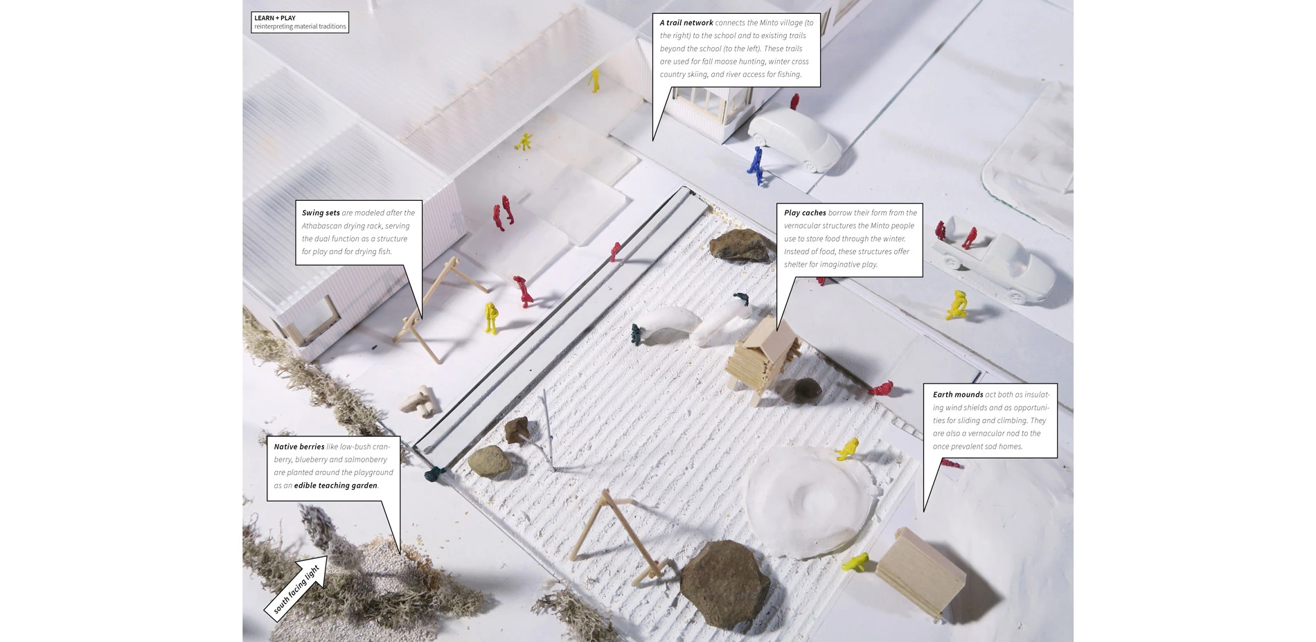 Programatically, this project addresses the lack of viable public spaces for Arctic inhabitants - specifically children - and the potential of landscape architecture to support needed outdoor space for a school and the greater community in Minto. Interior Alaska is a region of climatic extremes, ranging from -50F in the winter to 80F in the summer. The Athabascan people traveled in bands through the Minto Flats for thousands of years, migrating with the seasons, often meeting together in Minto during the cold season. The 20th century colonialism by the American government led to rapid cultural change in native Alaskan communities, including the shift from nomadic life to permanent settlement and the importation of building typologies from the "Lower 48".