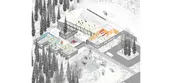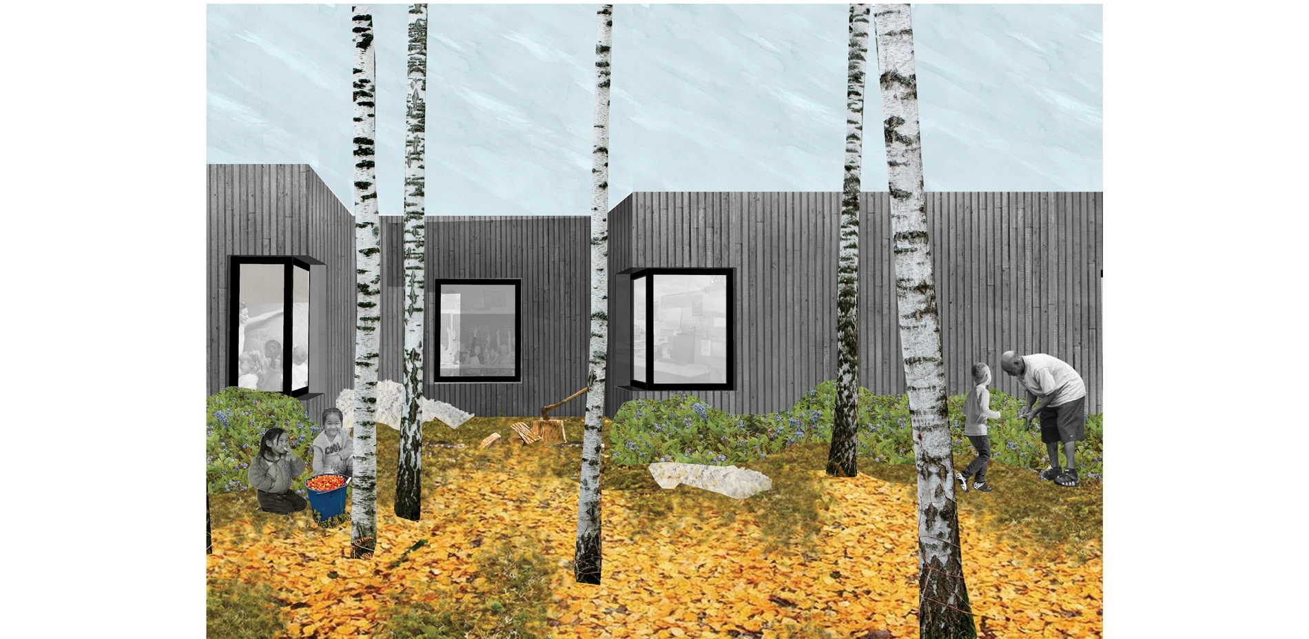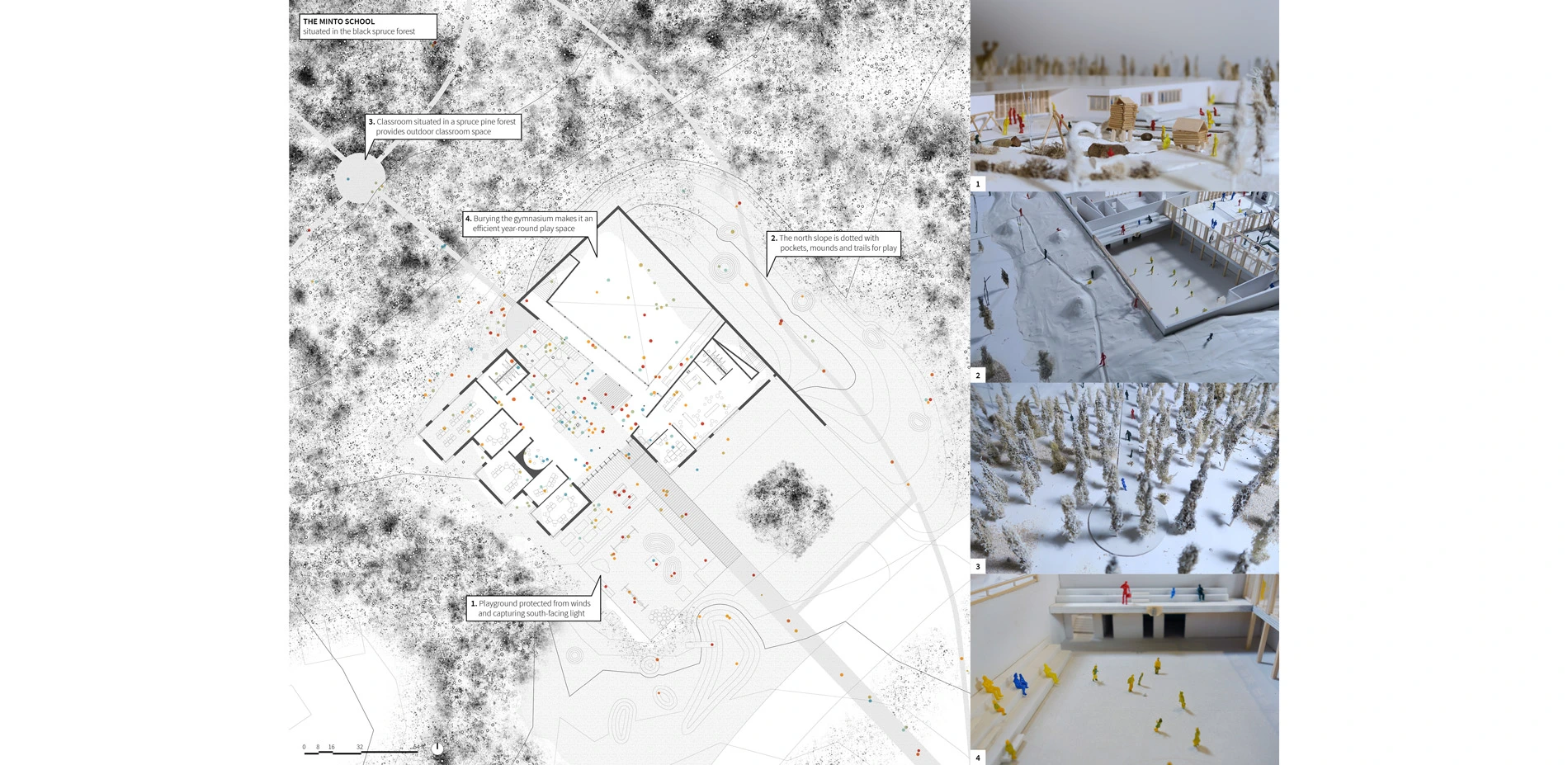 The designed landscape creates microclimates to mediate the extreme climate, protecting the indoor spaces and extending the usability of outdoor spaces. The school building is shielded from the harshest winds by positioning it at the edge of a black spruce forest and burying one side with a protective berm. These protective landscapes also generate an outdoor classroom in a forest clearing and a dynamic playful slope with pockets and mounds that intensifies with snowfall. To the south, the berm and building frame an outdoor playground and teaching garden, bringing light into the classrooms and creating a protected and dynamic outdoor play space. Secondary berms buffer the playground from the street and slides are embedded for multiple play opportunities. Play structures constructed from traditional Athabascan building techniques reinforce cultural heritage and provide varying elevations of play. Play extends beyond the confines of the playground out into the greater landscape. A network of trails connects the village to the southeast with the school and the spruce forest beyond. Native edible berries wrap along the classrooms on the south. The use of the vernacular gives the school a sense of place and responds to the needs of this unique culture and climate.