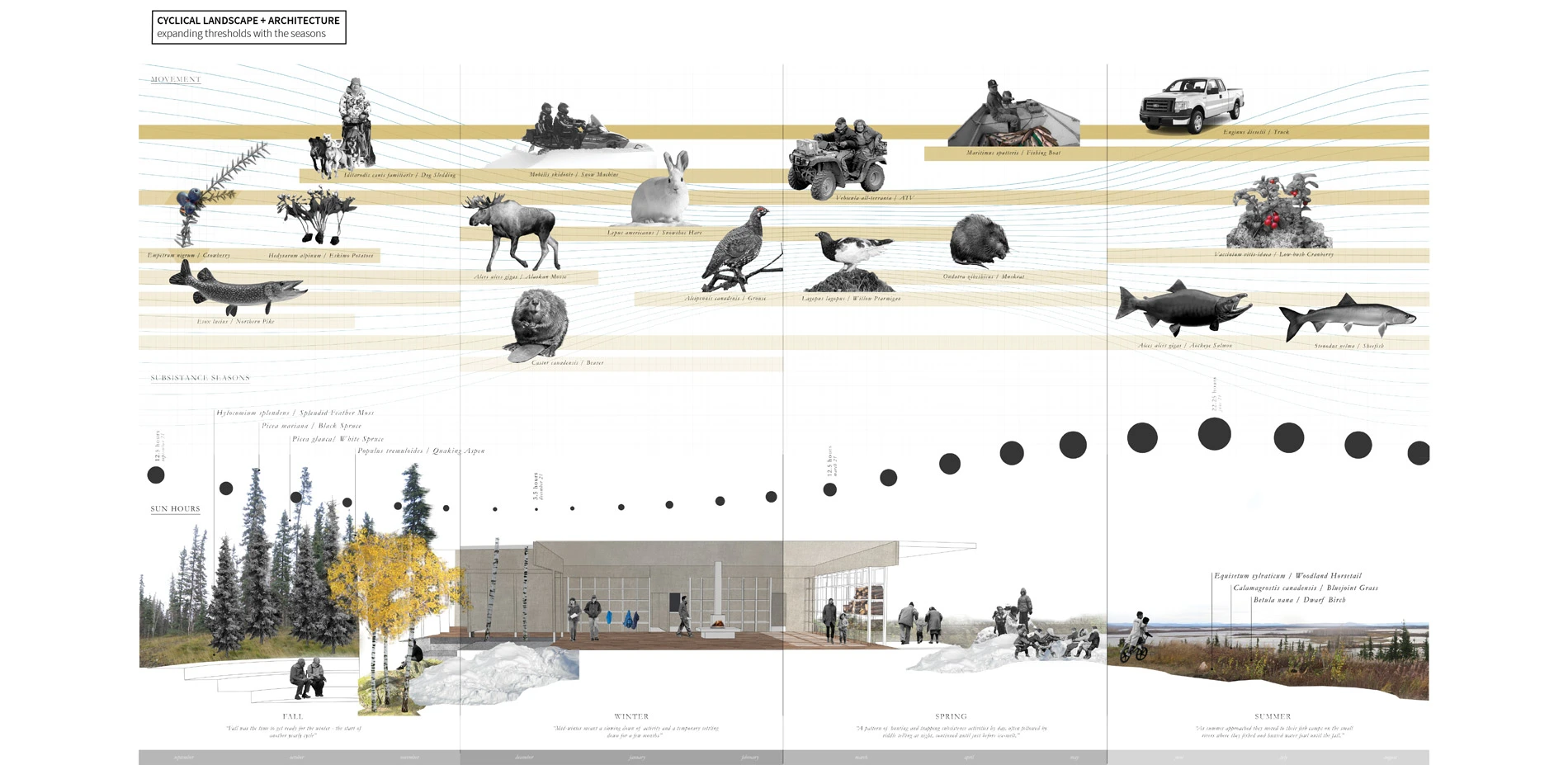 The project is grounded in research of the Arctic climate and ecology, native Alaskan (Athabascan) cultural practices, and principles of thermodynamics which drive the design of the school and its surrounding landscape. By creating a culturally-meaningful and climatically-specific environment, the design defines significant opportunities and overlaps between landscape architecture and architecture.